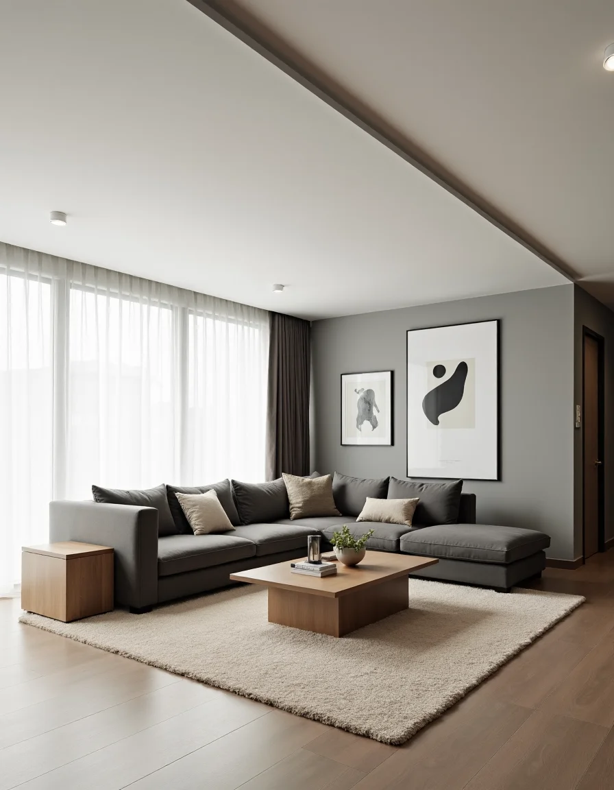 The living room features a spacious open layout with walls painted in a soft dove gray, creating a serene backdrop that enhances the modern aesthetic. A large, low-profile sectional sofa upholstered in a muted charcoal fabric is strategically arranged at the center, complemented by a pair of sleek marble side tables on either side, adding a touch of elegance. In front of the sofa, a rectangular coffee table crafted from natural oak with a matte finish rests atop a textured cream area rug, providing warmth and comfort underfoot. Floor-to-ceiling windows flood the space with natural light, while sheer white curtains allow for privacy without sacrificing brightness. Minimalist abstract artwork in monochromatic tones adorns the walls, further emphasizing the simplicity and sophistication of the design.