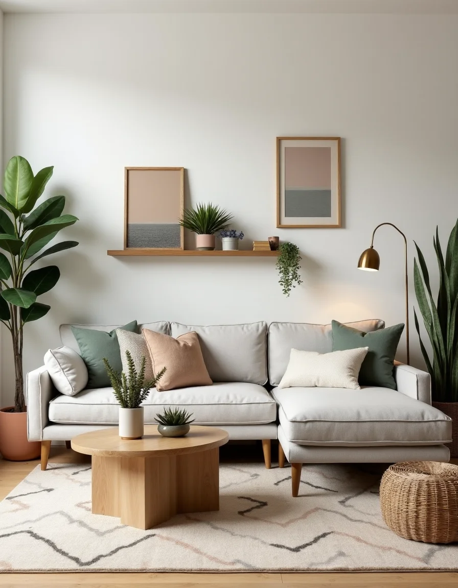 The living room showcases a harmonious Scandinavian design, featuring a large, plush light gray sectional sofa adorned with soft, textured throw pillows in muted pastel shades. A natural wood coffee table sits at the center, crafted from reclaimed oak, providing both functionality and warmth. Potted plants, including a tall fiddle leaf fig in one corner and smaller succulent arrangements on shelves, infuse the space with life and freshness. The walls are painted in a soft white, while a cozy area rug in a light beige with subtle geometric patterns defines the seating space, accompanied by a sleek floor lamp with a brushed brass finish that adds an inviting glow. To enhance the ambiance, minimalist art pieces in soft tones hang on the walls, complemented by woven baskets for storage that reflect the rustic charm of the Scandinavian aesthetic.