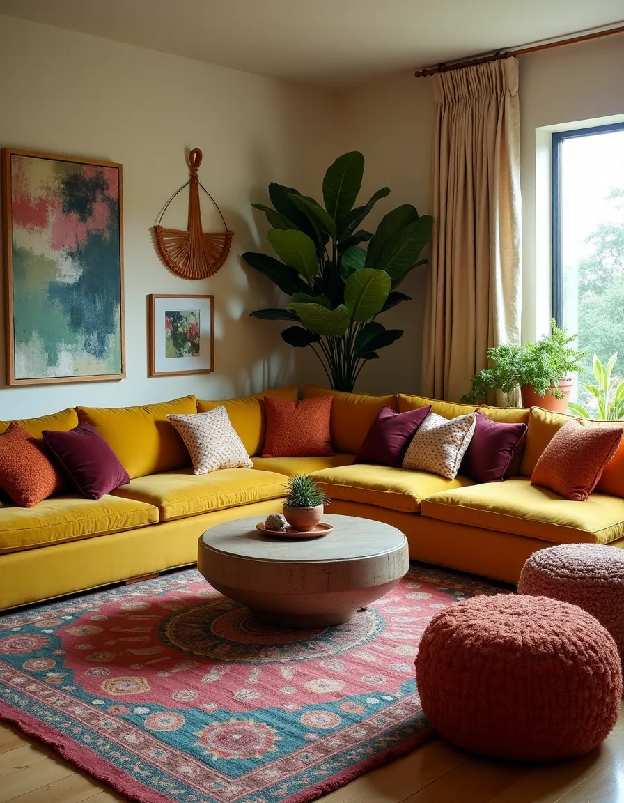 The living room embraces a bohemian style, embodying a warm and inviting atmosphere enhanced by earthy tones and vibrant colors. A plush, oversized sectional sofa in deep mustard yellow occupies the center, adorned with an array of patterned throw pillows in shades of terracotta, teal, and burgundy, encouraging relaxation and comfort. A large, intricately woven ornamental carpet lays beneath the coffee table—a round, reclaimed wood piece with a distressed finish, surrounded by a mismatched ensemble of vintage poufs in various textures, serving as additional seating. Walls are adorned with an eclectic mix of art—framed abstract paintings and mounted tapestries alongside handwoven macramé hangings, while lush green plants in terracotta pots bring life into the room, perfectly contrasting with the cool tones of the surrounding décor.