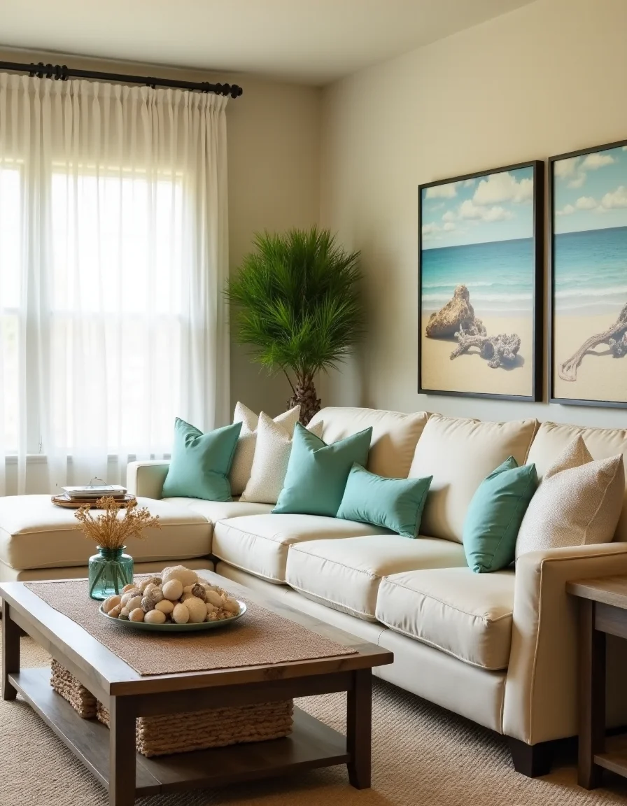 This living room embodies a refreshing seaside atmosphere with soft, sandy beige walls that exude warmth. A large, cream-colored sectional sofa is placed in the center, adorned with an array of light blue and seafoam green throw pillows that mimic ocean waves. In front of the sofa, a reclaimed wood coffee table sits invitingly, laid with a woven placemat and a centerpiece of assorted seashells nestled in a shallow glass bowl. Large, sheer white curtains hang gracefully from wooden rods at the wide windows, allowing sunlight to filter through, creating a bright and airy feel. The space is accented with decorative elements such as driftwood sculptures, nautical-themed wall art depicting serene beach scenes, and potted palm plants strategically placed in corners for a touch of lush greenery.