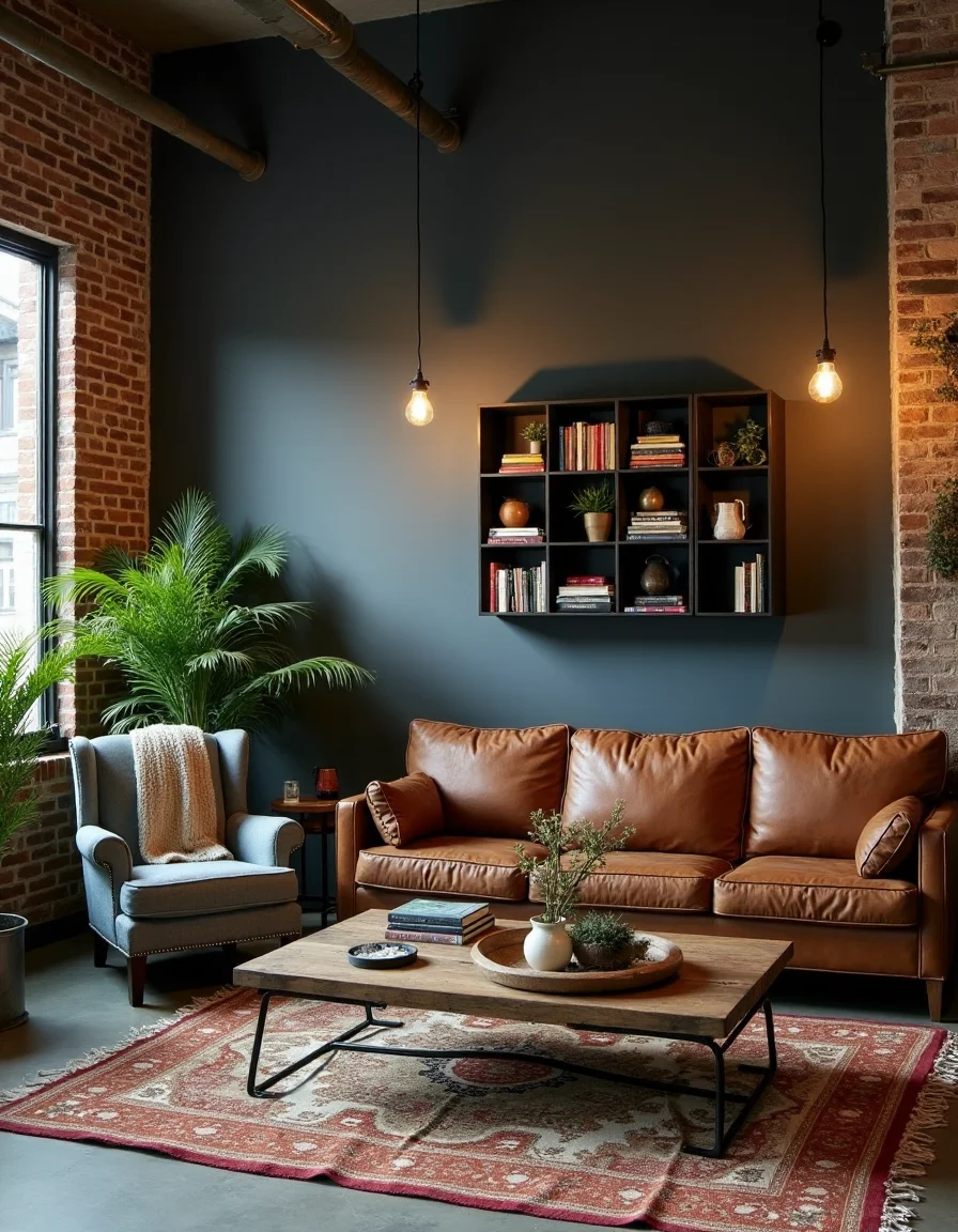 The living room embodies a bold industrial style, featuring exposed brick walls painted in a muted charcoal hue that enhances the raw ambiance. Centered in the space is a large, distressed leather sofa in deep brown, perfectly complemented by a rugged reclaimed wood coffee table with metal accents. A pair of vintage iron shelves are mounted on one wall, showcasing an array of eclectic books and potted succulents, while hanging pendant lights with Edison bulbs cast a warm glow across the room. In one corner, a cozy reading nook is created with a vintage armchair upholstered in faded denim and a worn, woolen throw draped over its arm. The space is punctuated with concrete flooring, layered rugs in earthy tones, and splashes of greenery from large ferns in metal planters, creating a chic yet welcoming industrial haven.