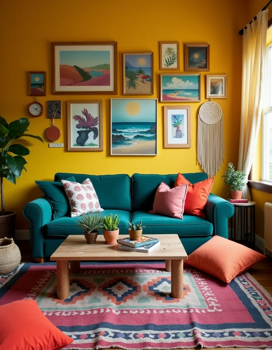 The living room exudes a vibrant bohemian charm, with colorful textiles and eclectic decor harmonizing to create a welcoming atmosphere. A plush, deep teal velvet sofa is positioned against a warm, sun-kissed yellow wall, adorned with an artistic gallery of varied paintings, including abstract pieces and vintage landscapes, all framed in mismatched styles. A large, intricately woven area rug featuring multicolored patterns anchors the space, while a low, reclaimed wood coffee table sits at its center, topped with an assortment of potted succulents and a stack of well-loved books. Floor cushions in bright reds, oranges, and greens scatter playfully on the floor, inviting guests to lounge comfortably, and macramé wall hangings and dreamcatchers add to the cozy and cheerful ambiance of this artistically expressive living area.
