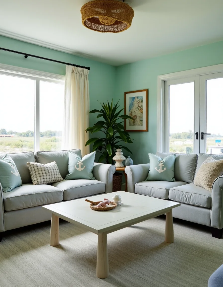 The seaside living room exudes a tranquil ambiance, dominated by soft blue hues reminiscent of the ocean. A plush, striped carpet in subtle cream and light blue tones anchors the space, while a large, whitewashed driftwood coffee table sits at the center, surrounded by a pair of light gray linen sofas adorned with coastal-themed throw pillows featuring anchors and seashells. Floor-to-ceiling windows draped with sheer white curtains allow natural light to flood the room, enhancing the airy feel, while walls painted in a calming seafoam green are adorned with framed nautical art and a beach-inspired gallery wall. A potted palm in the corner adds a touch of greenery, while soft, warm lighting from a ceiling fixture mimicking fishing nets provides a cozy glow, creating an inviting retreat for relaxation.