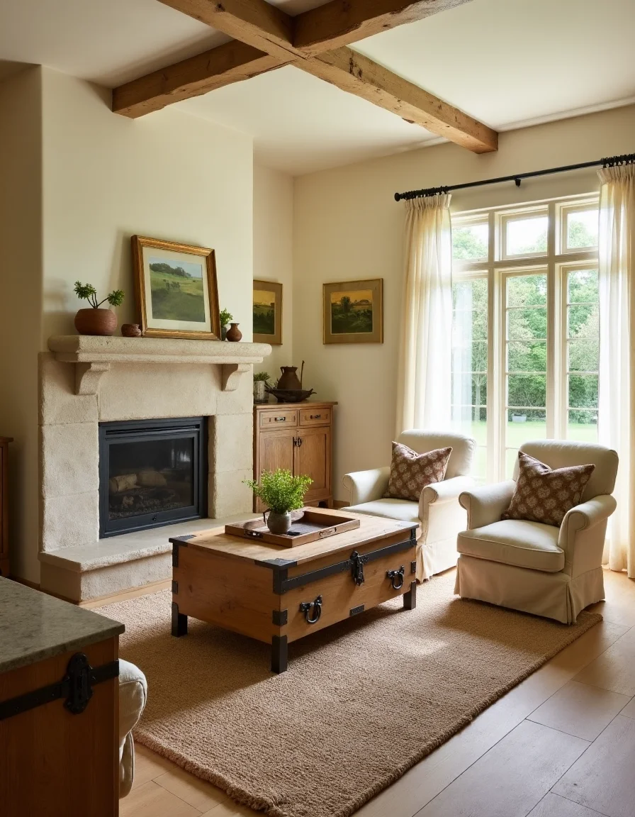 The living room exudes a cozy country charm, with soft beige walls that embrace earthy tones and textures throughout the space. A rustic wooden coffee table, made from reclaimed oak, sits at the center of the room, surrounded by a pair of plush cream-colored armchairs with light brown floral upholstery. Against one wall, a stone fireplace adds warmth, adorned with a mantel displaying handmade pottery and a few small potted succulents for a touch of greenery. Natural light streams through sheer linen curtains, which frame a large window that offers views of a lush garden; a braided jute area rug anchors the seating area and complements the warm wooden floors. Vintage accents, such as an antique wooden trunk serving as additional storage and subtle wall art featuring pastoral scenes, enhance the inviting, relaxed atmosphere.