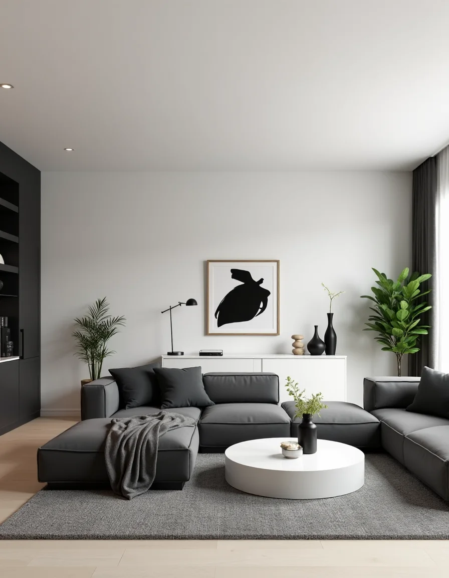 The living room embraces a minimalist aesthetic with an elegant monochrome color scheme, featuring shades of soft gray and crisp white. A sleek, low-profile sectional sofa in a deep charcoal hue occupies the center, paired with a large, geometric white coffee table that serves as both a surface for drinks and a chic decorative piece. Along one wall, a stylish, minimalist media console in matte white keeps electronic devices concealed, while an abstract black-and-white artwork hangs above it, adding a touch of sophistication. The space is punctuated by a few carefully placed green plants in simple black ceramic pots, providing a subtle contrast against the monochrome palette; a plush, textured gray area rug underfoot ties the elements together, emphasizing comfort without sacrificing the clean lines essential to the design.