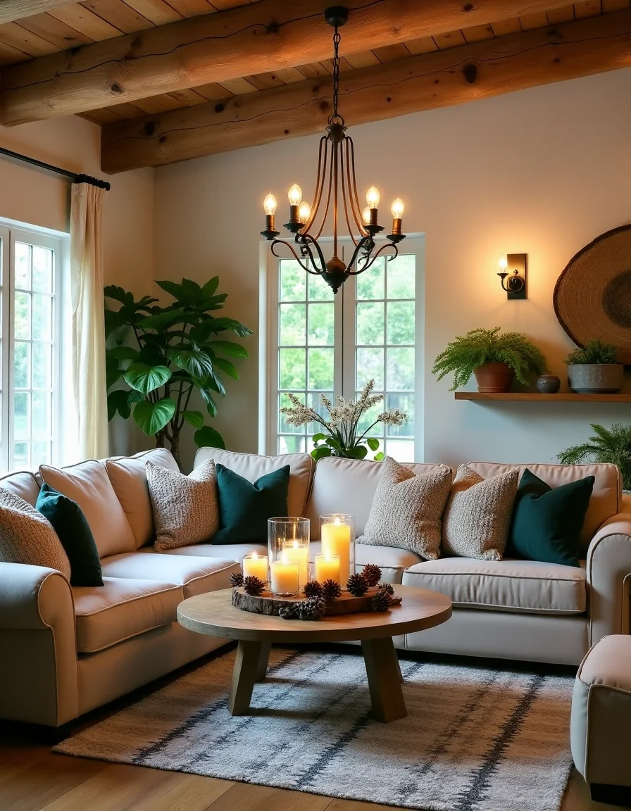 The living room exudes a rustic charm, featuring reclaimed barn wood beams spanning the ceiling, creating a cozy, organic atmosphere. A large, plush beige sectional sofa is positioned in an inviting U-shape, adorned with an array of knitted throw pillows in muted earth tones like taupe and forest green. A handwoven area rug with tribal patterns grounds the seating area, while a round, distressed wood coffee table sits at the center, topped with a flickering candle arrangement in mason jars surrounded by natural pinecones. The warm lighting comes from a wrought-iron chandelier with glowing Edison bulbs, complemented by soft wall sconces that cast a gentle ambiance, while various potted ferns and wildflowers strategically placed on rustic shelves add life and color throughout the space.