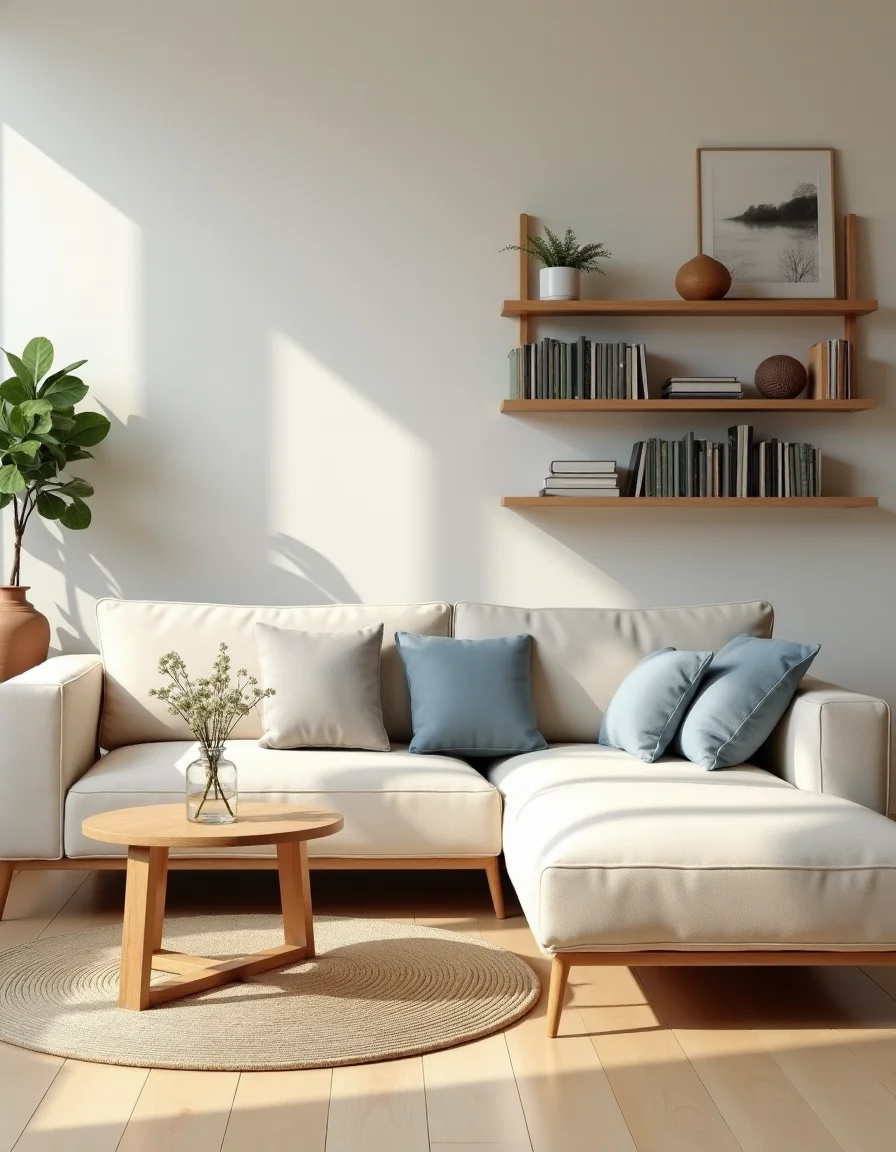 The living room exudes a serene Scandinavian aesthetic, featuring a spacious layout with pale wooden flooring that reflects natural light. A large, plush cream-colored sectional sofa is arranged against the wall, adorned with soft grey and muted blue throw pillows for added comfort. A minimalist wooden coffee table with sleek lines sits at the center, topped with a simple glass vase containing fresh wildflowers. In one corner, a tall indoor plant in an earthy terracotta pot adds a splash of greenery, while a stylish woven area rug in light beige grounds the space. Simple, handcrafted wooden shelves display a curated collection of books and minimalist decor, enhancing the practical yet inviting atmosphere.