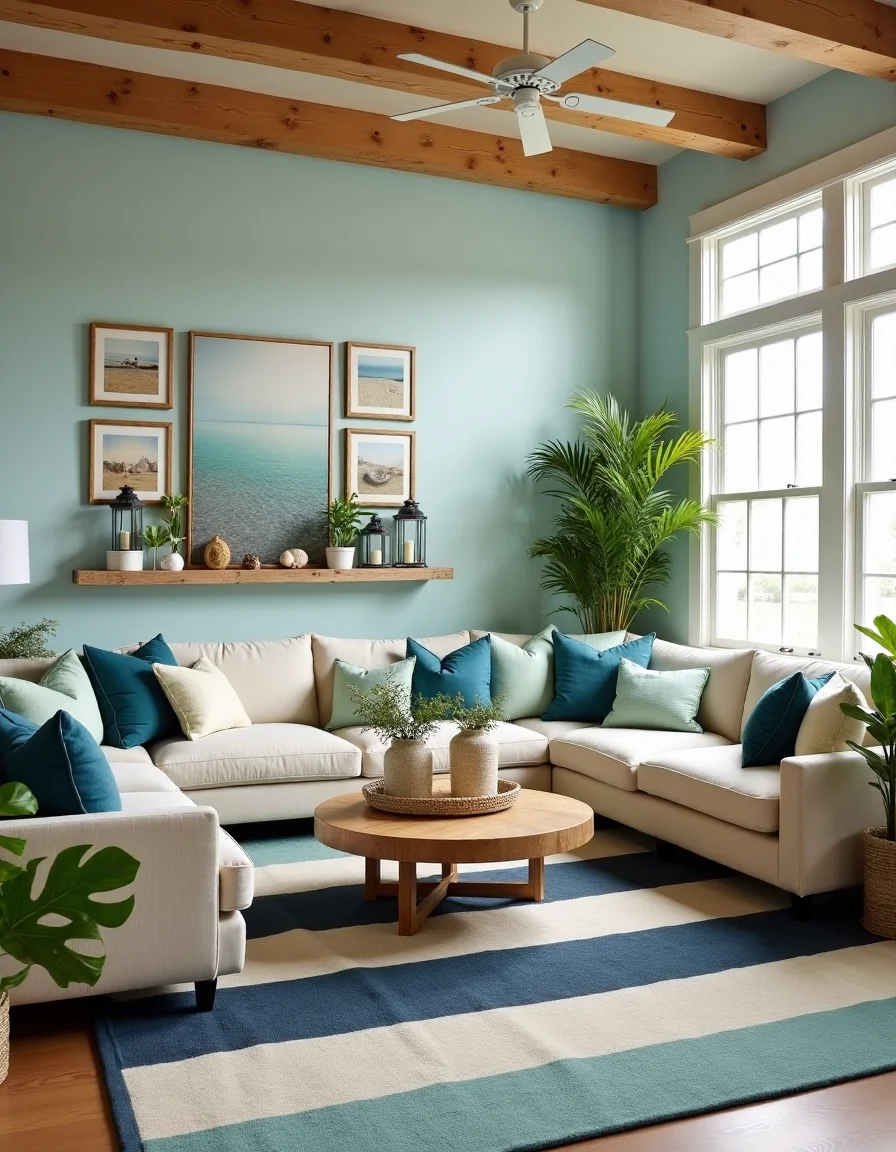 The living room embodies a relaxing seaside retreat, enhanced by natural wooden elements such as a light oak coffee table, antique beach wood console, and exposed beam ceilings that celebrate the nautical vibe. A large, comfortable, beige sectional sofa is adorned with an assortment of ocean-themed throw pillows in shades of teal, seafoam green, and sandy beige, promoting a casual yet inviting feel. Underfoot, a striped carpet in alternating hues of navy and white creates a nautical flair, while large potted plants (such as palms) in the corners add a lush vibrancy to the space. The walls are painted a soft coastal blue, adorned with framed beach prints and a driftwood shelf displaying seashell decorations and glass lanterns to evoke a breezy atmosphere.