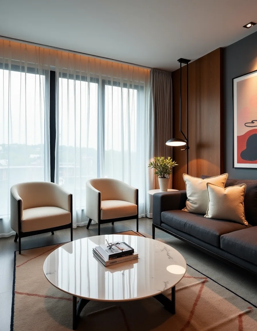 The living room exudes a sleek modern aesthetic with its clean lines and quality materials. A plush, charcoal-gray sectional sofa rest directly opposite a striking white marble coffee table, its polished surface beautifully reflecting the glow of the ambient lighting. Adjacent to the sofa, a pair of minimalist black metal armchairs provide additional seating, each adorned with soft cream cushions for comfort. The walls feature a stylish charred wood paneling accent combined with large windows dressed in lightweight sheer white curtains, allowing natural light to flood the space while maintaining privacy. Finishing the room are abstract wall art and a bold geometric area rug that adds splashes of color and warmth to the cool stone-like ambiance, creating an inviting yet sophisticated atmosphere.