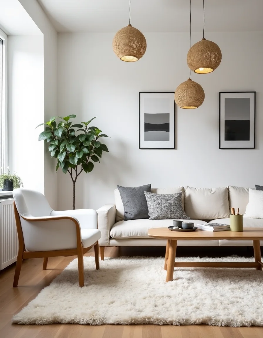 This Scandinavian-style living room emanates a serene and minimalistic atmosphere, characterized by a harmonious palette of pale whites, soft grays, and muted pastels. The space features a large light oak coffee table at the center, surrounded by three sleek, white Scandinavian-inspired chairs with wooden legs, affording a warm contrast. A plush, off-white area rug lies beneath, adding comfort and texture, while a tall indoor plant in a woven basket sits in one corner to bring a touch of nature indoors. Additional accents include a set of hanging pendant lights made of natural rattan above the seating area, and framed black and white art prints on the walls, which enhance the modern yet cozy appeal of the room.