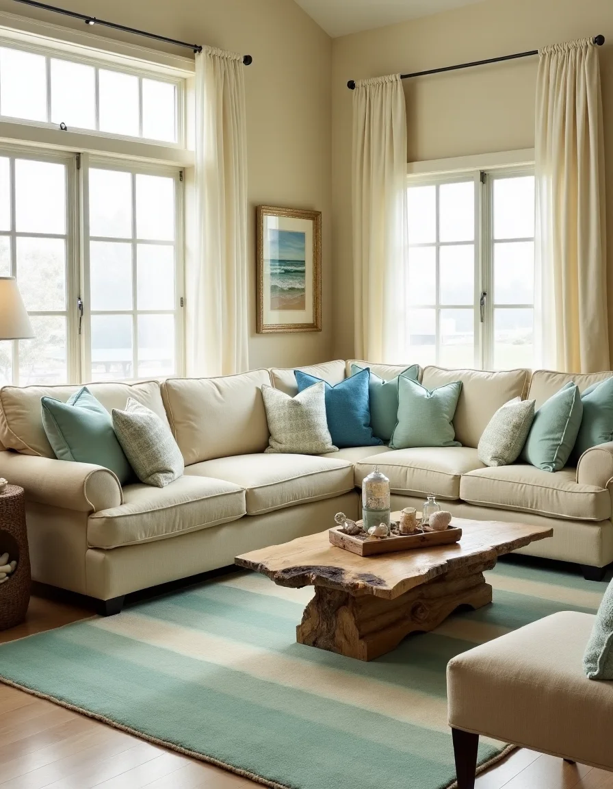 The living room exudes a tranquil seaside atmosphere, accentuated by soft beige shades that create a warm, inviting space. A large, plush sectional sofa, upholstered in a light sand-colored fabric, sits in the center, adorned with an array of ocean-themed throw pillows in various blue hues and coral patterns. The floor is covered with a wide-striped carpet in shades of cream and seafoam green, mirroring the waves. A rustic coffee table made from reclaimed driftwood rests atop the carpet, surrounded by coastal-inspired decor such as seashells in glass jars and framed seascape prints on the walls. Large windows draped with sheer, airy white curtains allow natural light to flood the room, completing the serene beachside vibe.