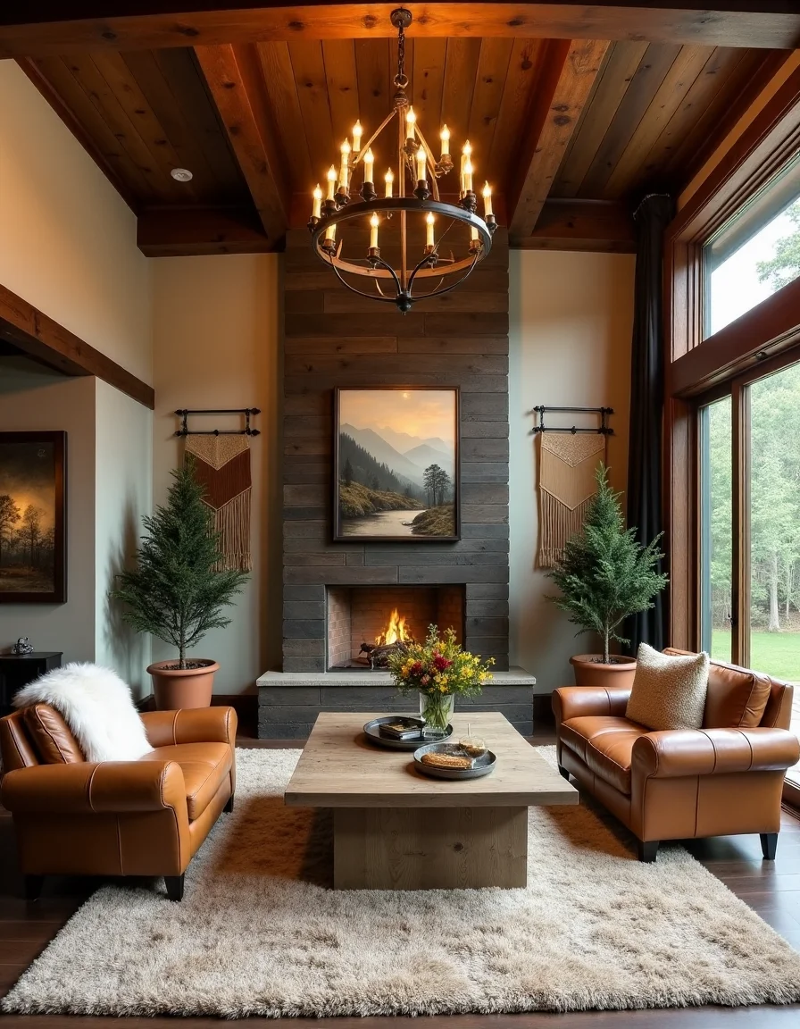 The living room embraces a rustic charm with its rich wooden beams accentuating the high ceiling, creating a warm and inviting atmosphere. A plush, beige wool area rug lies beneath a large, distressed oak coffee table that anchors the space, surrounded by a pair of oversized, weathered leather armchairs adorned with cozy faux fur throws. The walls are lined with reclaimed wood paneling, artfully displaying an eclectic mix of nature-themed artwork and woven tapestries that echo the earthy tones of the landscape. A handmade, wrought iron chandelier hangs overhead, its flickering candle-like bulbs casting a soft, golden glow, while potted evergreen plants in terracotta pots add a touch of greenery and freshness to the space.