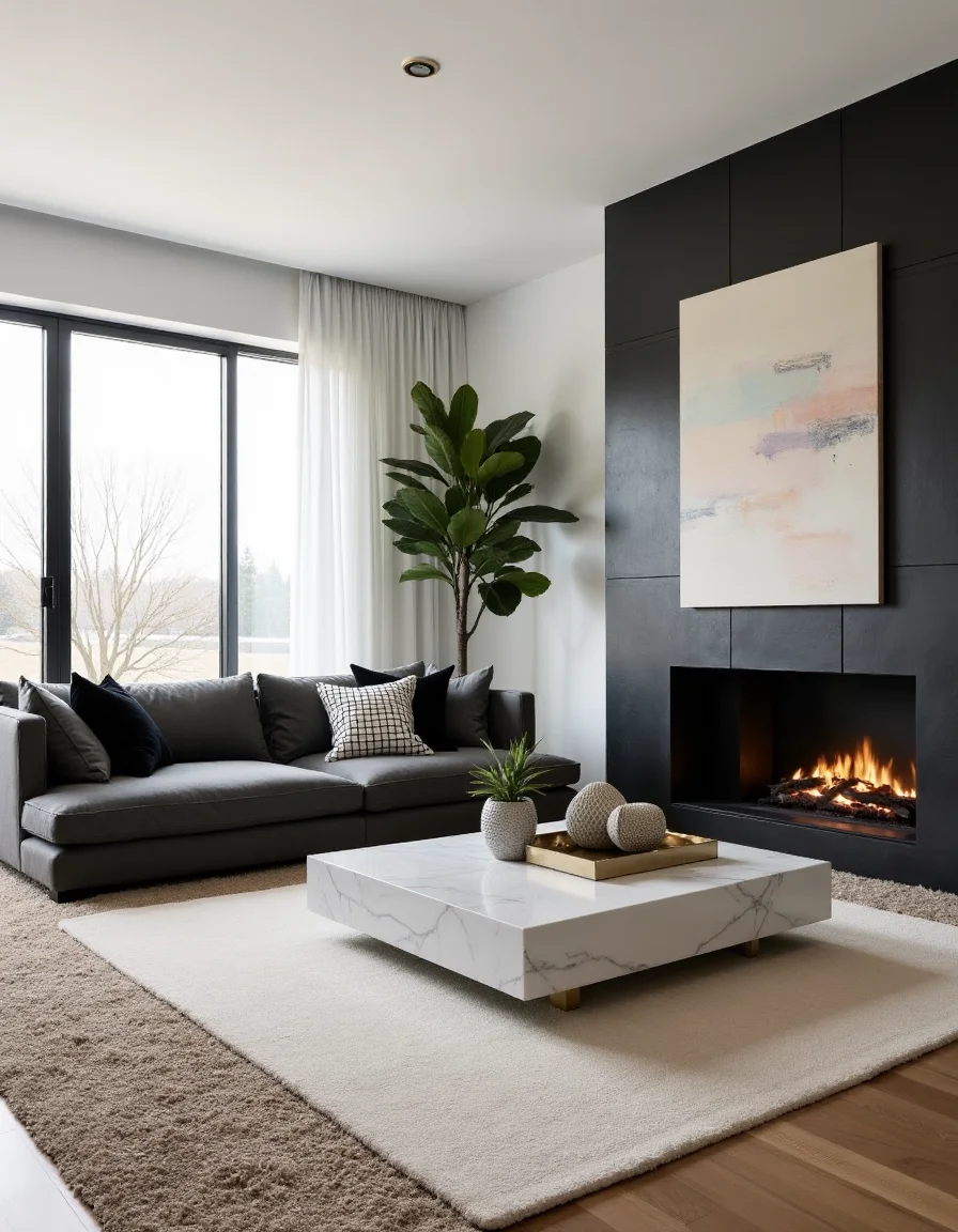 This modern living room boasts a sleek and sophisticated design, featuring clean lines and a minimalistic aesthetic that exudes elegance. The centerpiece is a large, rectangular white marble coffee table with subtle gray veining, sitting atop a plush, textured area rug in soft beige tones that anchors the seating area. A pair of charcoal gray, modular sectional sofas, equipped with adjustable headrests, are arranged symmetrically around the coffee table, adorned with bold black and white geometric throw pillows for contrast. Large floor-to-ceiling windows drape the space in natural light, framed by sheer white curtains, while a striking feature wall made of polished basalt stone provides depth and texture. For accents, an oversized abstract painting in muted pastels hangs above the mantel, and sleek metal accent trays and decor pieces offer a hint of sophistication throughout the space.