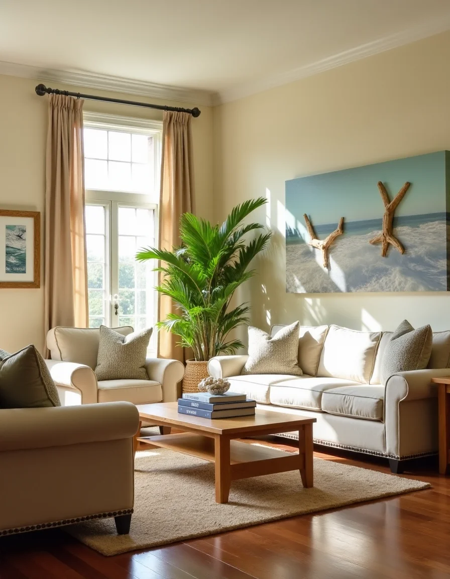 The living room embodies a serene seaside aesthetic, with walls painted in soft beige, creating a warm and inviting backdrop. Plush, sand-colored sectional sofas are arranged in a cozy formation around a light oak coffee table, adorned with coastal-themed books and a small vase filled with white seashells. Light beige curtains billow softly against the gentle ocean breeze from the large window, allowing rays of sunlight to seep in and dance across the polished wood floor. A pair of handcrafted wooden side tables flank the sofas, while tropical potted plants in wicker baskets add vibrant green hues and a touch of nature to the airy atmosphere. Nautical-inspired wall decor, including framed marine art and driftwood accents, complete the space, making it feel like an idyllic beach retreat.