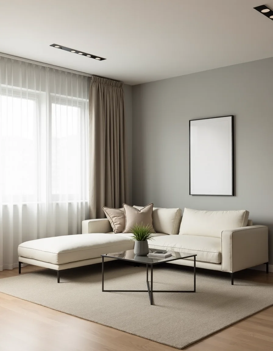 The living room embodies a minimalist aesthetic, featuring a spacious layout designed to highlight negative space. The walls are painted in a soft dove gray, complementing the light maple hardwood flooring. A sleek, low-profile sectional sofa in creamy white occupies one side of the room, with a pair of elegant, geometric accent pillows in subtle beige hues adding a touch of warmth. In the center, a glass coffee table with a thin metallic frame holds a single potted succulent, enhancing the open feel. Near the large, unobstructed window, sheer linen curtains allow natural light to filter in softly, while a single minimalist art piece in black and white adorns the wall opposite the couch, creating focal interest without overwhelming the simplicity of the space.