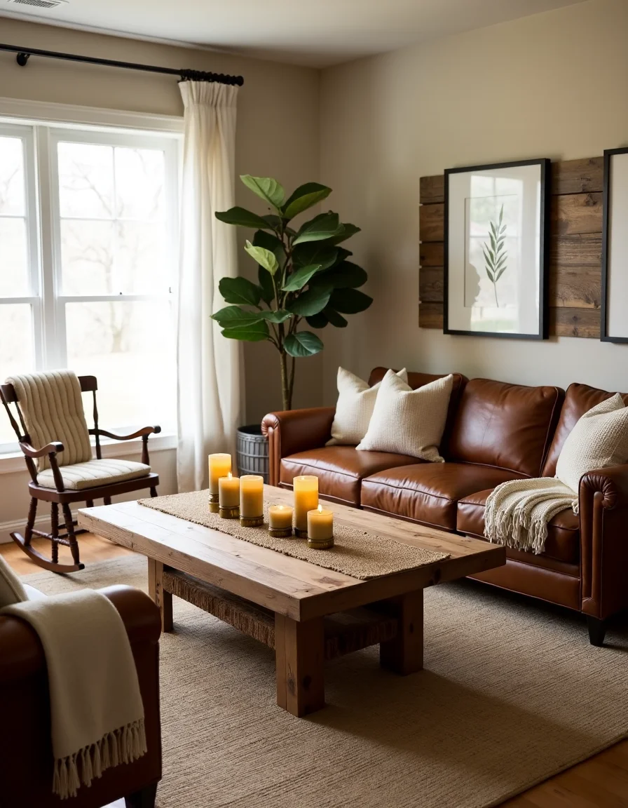 The living room exudes a rustic charm with its warm and cozy ambiance created by a palette of soft beiges, taupes, and earthy browns. A large, reclaimed wood coffee table sits at the center, adorned with a woven jute runner and a cluster of antique brass candles that flicker in the natural light streaming through sheer white linen curtains. Surrounding the coffee table, a pair of luxurious deep brown leather sofas are arranged with oversized knit throw blankets draped over the armrests, while a vintage wooden rocking chair adds a touch of nostalgia in one corner. The room is anchored by a hand-woven area rug featuring a muted geometric pattern, and the walls are decorated with framed botanical prints resting on thick, uneven wood planks, bringing a touch of nature indoors and enhancing the raw, organic feel of the space.