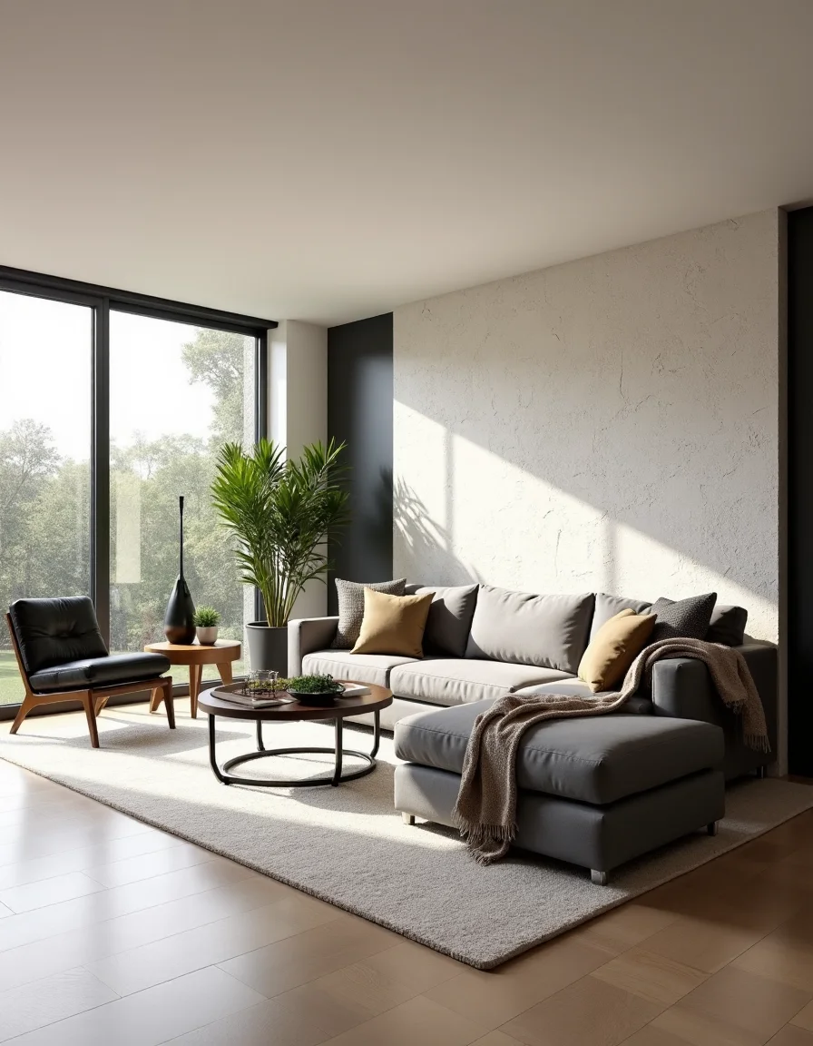The living room features a minimalist design highlighted by a sleek, contemporary gray sectional sofa, positioned centrally against a textured white stone accent wall that draws the eye. A large, round glass coffee table sits atop a soft, off-white area rug, reflecting the natural light streaming in from the floor-to-ceiling windows that frame a beautiful outdoor view. Flanking the sofa are two black leather armchairs with clean lines, while a mid-century modern wooden side table holds a striking abstract sculpture. To add warmth, a simple quilted throw blanket in muted earth tones is draped casually over one corner of the sofa, and a few potted succulents are arranged on a floating shelf above a low-profile media console, completing the space with a touch of nature.