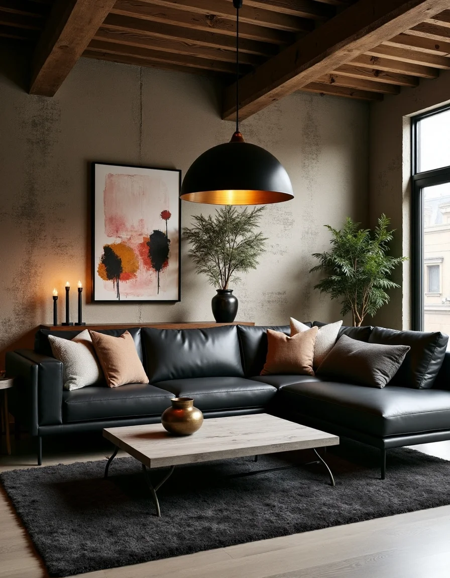 The living room embraces an industrial aesthetic, showcasing a prominent deep charcoal leather section sofa, positioned at the center against a faded brick accent wall. Flanking the sofa, two sleek, black metal side tables hold sculptural candles in matte black holders, creating a moody atmosphere. Above, raw wood beams line the ceiling, complementing a statement piece of abstract art with bold splashes of color that contrast against the otherwise muted palette. A distressed concrete coffee table in the center rests atop a dark, thick-pile rug that adds warmth underfoot, while potted greenery casualize the robust vibe, placed thoughtfully in bronze planters perched on a vintage-style media console made of reclaimed wood and iron. Ambient lighting is provided through an oversized, factory-style pendant lamp hanging centrally, accentuating the room's high ceilings.