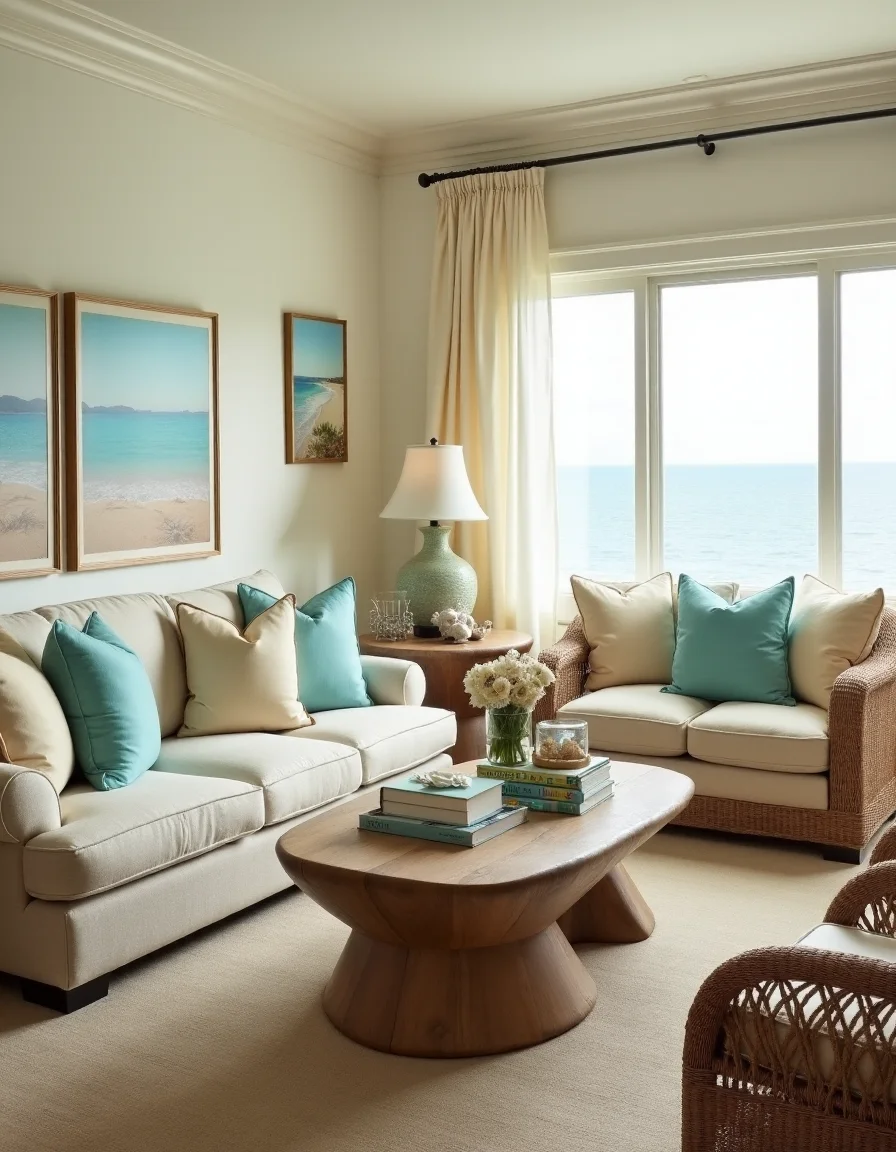 The living room exudes a tranquil seaside ambiance with its soft beige palette enhanced by hints of sandy tan and sky blue accents. A plush, large sectional sofa upholstered in a light beige fabric sits in the center, adorned with an assortment of fluffy throw pillows in shades of soft aqua and creamy white. A weathered wooden coffee table, resembling driftwood, occupies the space in front of the sofa, adorned with a collection of seashells in a glass vase and a couple of nautical-themed books. The walls are painted in a gentle coastal white, complemented by framed prints of serene ocean landscapes that evoke the feeling of being at the beach. Additionally, woven wicker armchairs against the walls provide additional seating, while sheer, billowy curtains dance softly with the ocean breeze from an open window, creating a bright and airy feel throughout the room.