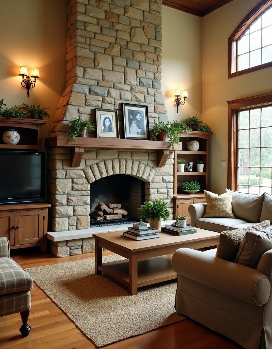 The living room embodies a cozy country charm, exuding warmth through earthy tones such as rich browns, soft greens, and muted yellows. A large, textured stone fireplace serves as the focal point, complete with a rustic wooden mantel adorned with vintage family photographs in simple frames. A comfortable, overstuffed beige sectional sofa wraps around a weathered oak coffee table, surrounded by a mix of oversized plaid and knitted throw pillows that invite relaxation. On the walls, self-made wooden shelves house potted plants and hand-painted ceramic pots, while a braided jute rug lies beneath, adding an organic touch to the wide-planked wooden floors. Cozy down lighting from wrought iron sconces illuminates the space, enhancing the inviting atmosphere of this country-themed retreat.