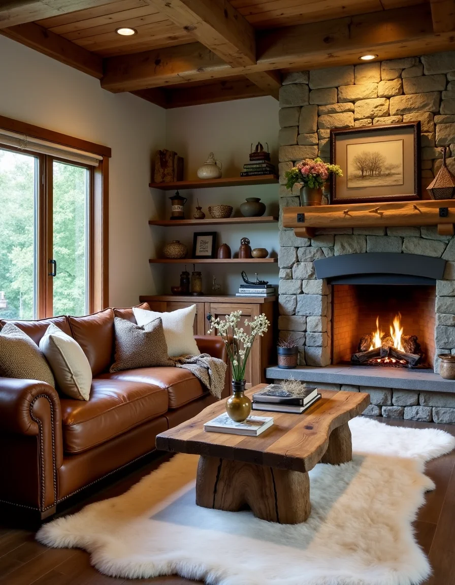 This cozy rustic living room exudes warmth and charm with its rugged decor. A plush, oversized brown leather sofa with well-worn edges sits at the center, adorned with various textured throw pillows featuring earthy tones and patterns. To one side, a reclaimed wood coffee table boasts a live edge, while on the opposite wall, a stone fireplace framed by logs crackles gently, enhancing the inviting atmosphere. The room is further decorated with a large, soft ivory fur rug underfoot, and rough-hewn wooden shelves displaying wildflower vases and vintage books, casting a homey, organic feel throughout the space.