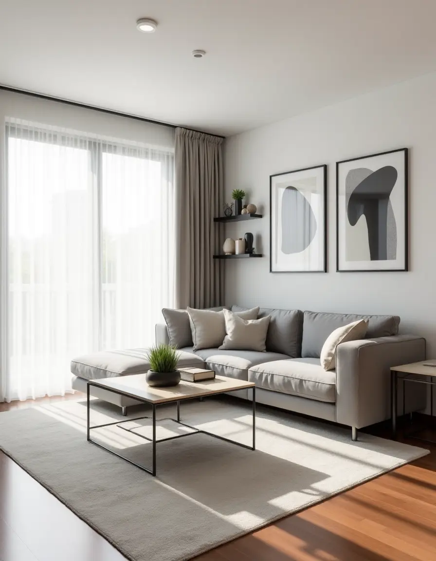 The living room embodies a modern aesthetic with a serene color palette of whites, greys, and soft earth tones. A sleek cream marble coffee table sits at the center, surrounded by a pair of minimalist glass side tables, each topped with a small succulent in a matte black pot. A plush, low-profile sectional sofa in a cool grey fabric faces a large floor-to-ceiling window, allowing natural light to flood in, while sheer white curtains drape gracefully to either side. On the walls, abstract black and white artwork brings a contemporary flair, complemented by a few strategically placed geometric shelves showcasing decorative items like modern vases and candles. The polished hardwood floor is softened by a simple, monochrome area rug that ties the whole modern look together.