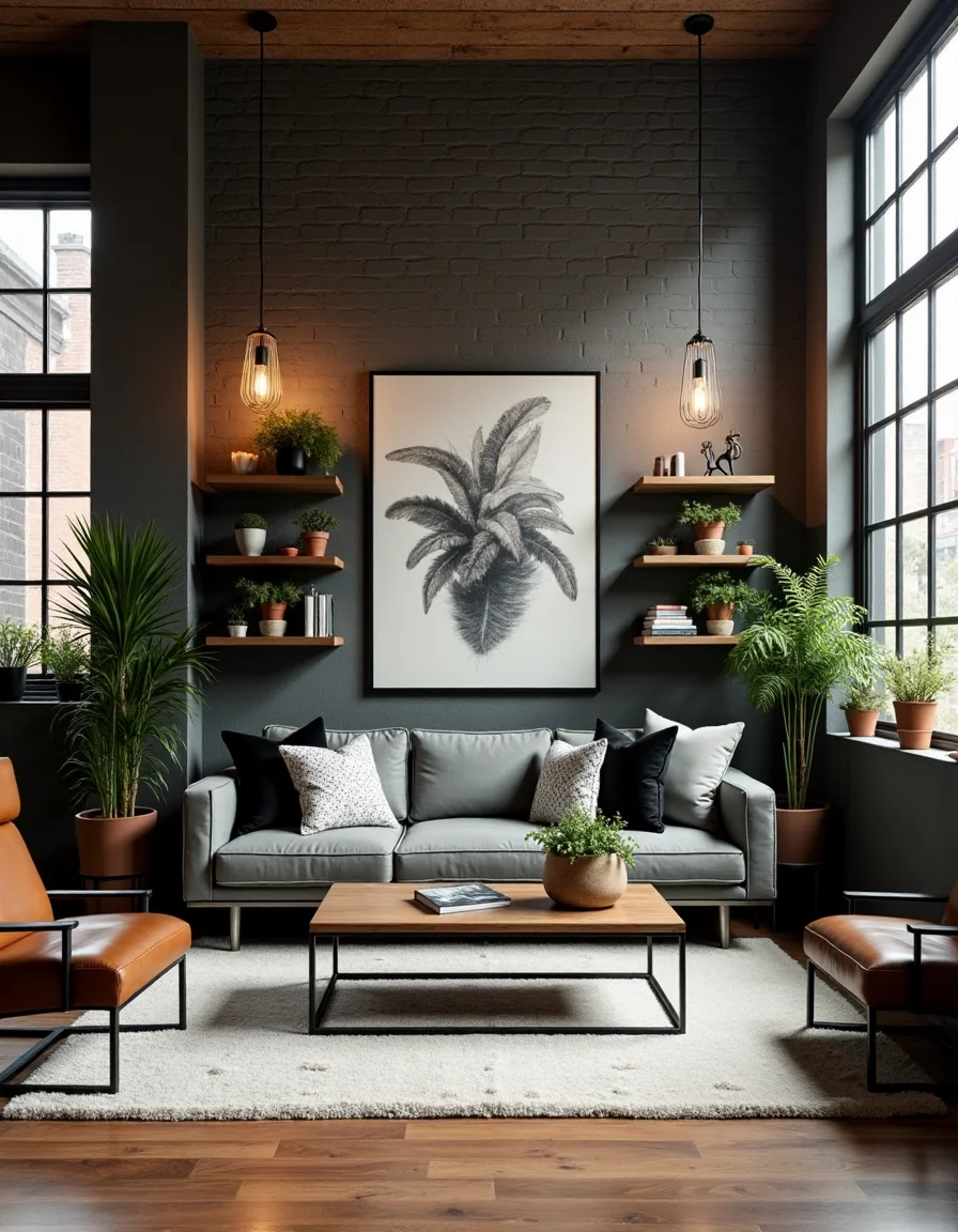 The living room embodies an industrial vibe with its prominent features, such as a stunning wall of exposed brick painted in a deep charcoal shade, paired with large, ceiling-high steel-framed windows that let in natural light, enhancing the open atmosphere. In the center is a spacious, slate-gray sectional sofa adorned with textured black and white throw pillows, perfectly positioned to face a low-profile reclaimed wood coffee table with metal legs, adding an organic touch to the sleek surroundings. Flanking the sofa, two vintage-inspired metal chairs showcase rich brown leather upholstery, while wire industrial-style pendant lights hang overhead, providing warm ambiance and stylish illumination. Accenting the scene are various potted succulents and an artful arrangement of rustic shelves showcasing an eclectic collection of books and retro decor items, all thoughtfully curated to reflect the charm of urban loft living.