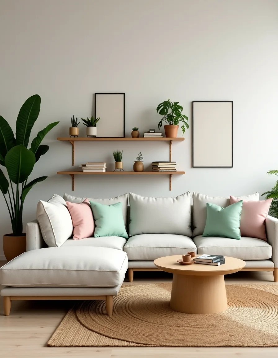 The living room features a light color palette dominated by soft whites and warm wood tones, creating a bright and airy atmosphere. A large, comfortable sectional sofa in light gray is positioned centrally, adorned with pastel-colored cushions in shades of mint green and blush pink. A natural wood coffee table sits in front, complemented by a woven jute rug that adds a touch of texture to the space. Lush indoor plants, including a tall snake plant and a small fiddle leaf fig, are strategically placed in corner pots to bring life to the room, while a minimalist bookshelf filled with neatly arranged decor and books creates an inviting focal point. Simple wall art in muted tones adorns the walls, enhancing the Scandinavian aesthetic of functionality and cozy tranquility.