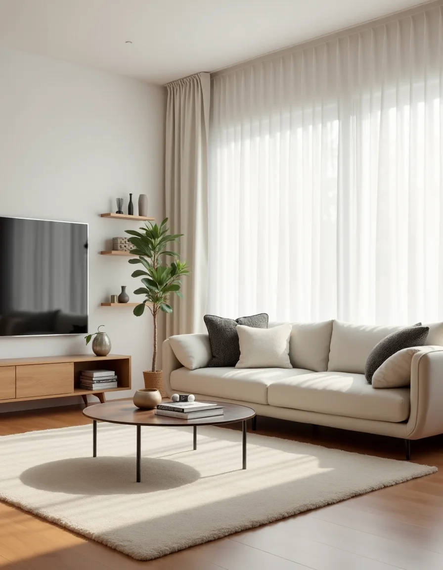 This minimalist living room embodies a serene and uncluttered atmosphere, showcasing a harmonious palette of soft whites and muted grays. A sleek, low-profile sofa in a light beige fabric anchors the space, adorned with a pair of monochrome throw pillows for subtle contrast. Adjacent to the sofa, a simple glass coffee table sits atop a large, plush area rug in a soft off-white shade, providing warmth and texture to the hardwood flooring beneath. A streamlined media console in natural wood houses minimal decor, such as a few art books and a single potted succulent, while two understated wall-mounted shelves display carefully curated ceramic vases. Natural light floods the room through sheer curtains, creating an inviting ambiance that emphasizes the clean lines and functional design of the space.