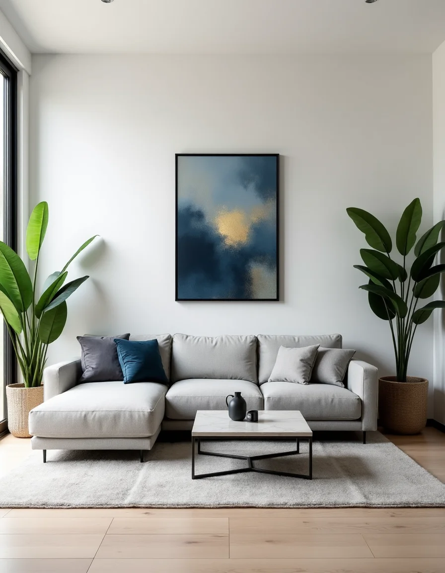 The modern living room is a seamless blend of simplicity and sophistication, characterized by its clean lines and minimalist aesthetic. A sleek, L-shaped sectional sofa in a soft gray fabric sits prominently against the wall, complemented by a low-profile, rectangular coffee table made of smooth stone with metal legs at the center of the seating area. Above, an abstract artwork featuring hues of blue and gold adorns the white walls, enhancing the space's dynamic yet serene vibe. A plush area rug with a subtle geometric pattern anchors the space, while towering potted plants in the corners inject a touch of nature and vibrancy, creating a balanced atmosphere that offers comfort and elegance.