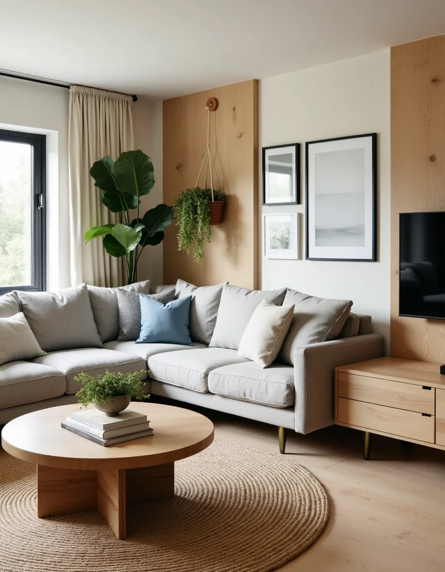 The living room is a serene Scandinavian haven, characterized by its use of natural materials and earthy tones. A large, light wood coffee table sits at the center, framed by a plush, neutral-toned sectional sofa adorned with varying textures of soft cushions in gentle blues and grays. A statement wall features wooden paneling, while a collection of indoor plants—like a tall fiddle leaf fig in the corner and trailing pothos hanging from a macrame plant hanger—adds life and vibrancy to the space. A large, woven jute rug anchors the area, complemented by minimalist art prints in simple black frames above a sleek media console made of reclaimed wood, enhancing the room's practicality and warmth.
