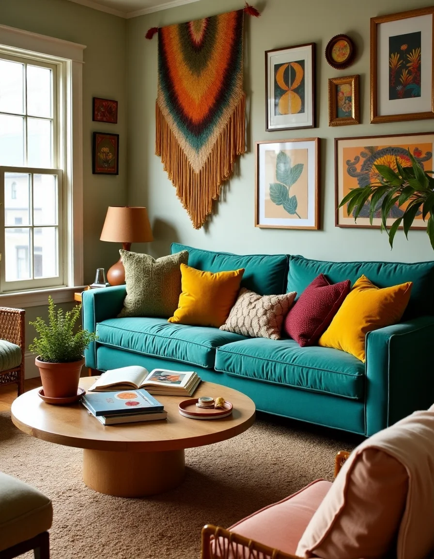 The living room exudes a vibrant bohemian vibe, filled with an assortment of eclectic furniture and richly patterned textiles. A large, well-worn, deep turquoise vintage sofa sits center stage, adorned with a collection of mismatched throw pillows in various textures—some knitted, others in geometric prints—ranging from mustard yellow to deep burgundy. In front of the sofa, a round, natural wood coffee table anchors the space, topped with a terracotta pot brimming with lush green ferns, a couple of funky coasters, and an open book with colorful artwork. Surrounding the room are an array of mismatched accent chairs—one a sleek mid-century modern design in a faded emerald green, and another a rattan lounger with soft, overstuffed cushions in a muted sunflower print. The walls are decorated with an artful display of macramé hangings, a vibrant woven tapestry, and framed prints featuring abstract patterns, enhancing the boho atmosphere while an oversize jute rug grounds the area beneath, adding warmth and texture to the space.