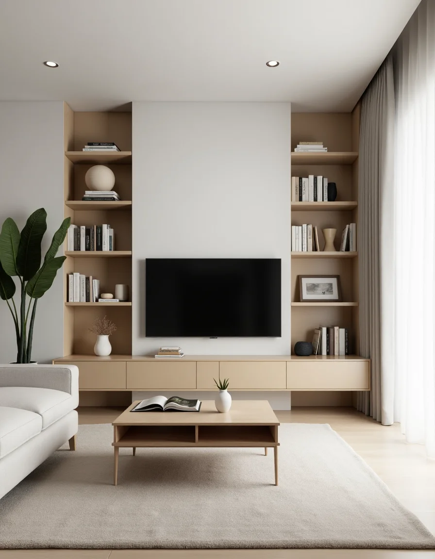 The living room is a serene oasis, furnished in a minimalist style that features a palette of soft neutral colors like whites, grays, and beiges. A low-profile sectional sofa, covered in light gray fabric, anchors the space, complemented by a sleek, rectangular wooden coffee table with a natural finish, which serves both as a surface for decorative items and genuine multifunctional use for casual dining. Along the far wall, a minimalist media console houses a low-profile flat-screen TV, elegantly framed by two tall, slim bookshelves filled with an array of carefully selected, monochromatic books and decorative objects to maintain a streamlined look. The space is accented with a single, large potted snake plant in one corner, bringing an organic touch that softens the clean lines of the room, while sheer white curtains gently filter the sunlight, enhancing the calm ambiance throughout this simplified yet stylish living area.