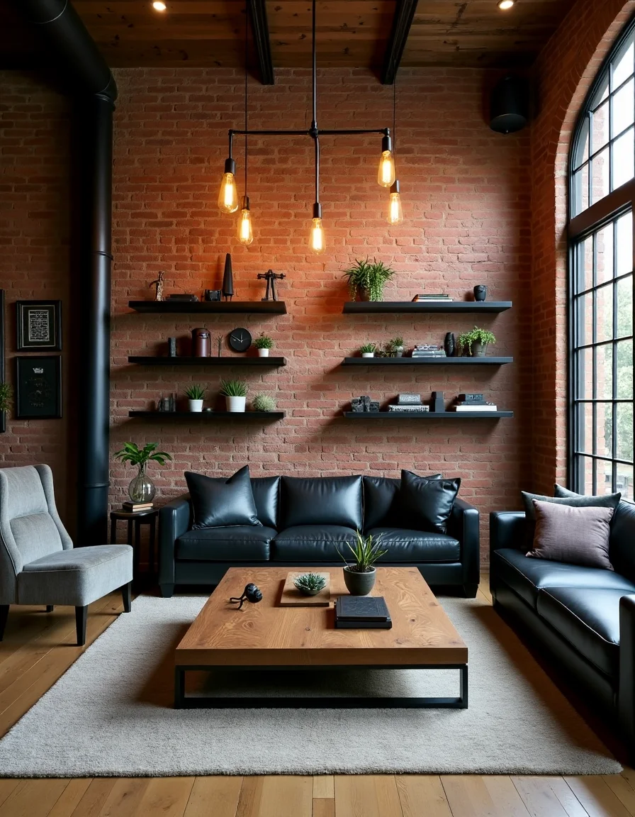 The living room embraces an industrial aesthetic, featuring expansive exposed burnt brick walls that lend warmth and character to the space. A striking solid walnut coffee table sits at the center, surrounded by a mix of black leather sofas and a distressed gray armchair, with a rough-hewn iron-frame side table on one side. Above them hangs a vintage-style filament bulb chandelier, providing soft ambient lighting as it hang from a series of thick, black iron pipes. Against one wall, an array of open iron shelves displays curated industrial-style decor items, including metal sculptures, potted succulents, and an antique clock, while the rustic wooden flooring adds a rugged touch, enhancing the overall moody aesthetic.