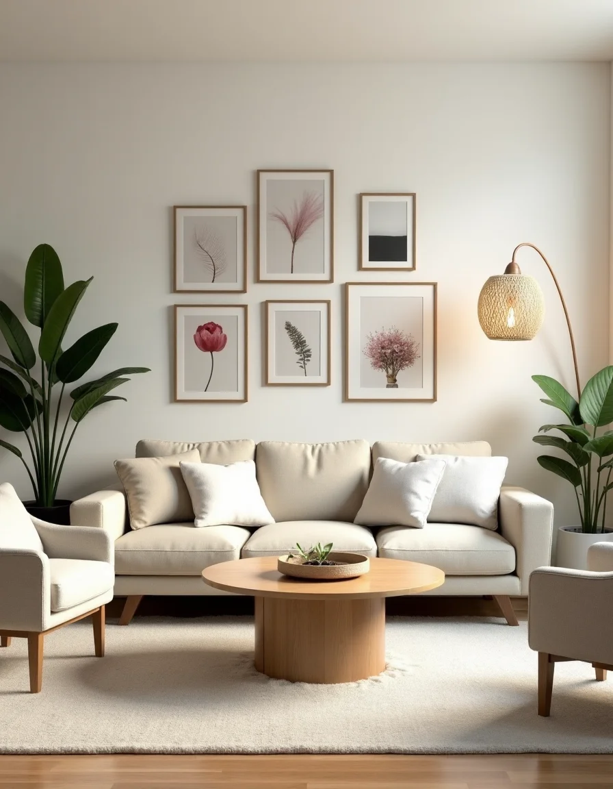The living room embodies a Scandinavian design, defined by soft colors and pale tones that create an inviting and cozy atmosphere. A large, plush beige sofa adorned with fluffy white throw pillows is positioned centrally, facing a minimalist oak coffee table with rounded edges. Flanking the sofa are two light gray armchairs that offer additional seating without overcrowding the space, while a light wool area rug in a soft cream hue lies underneath, providing warmth. The walls, painted in a soft off-white shade, feature a gallery of framed nature-inspired art, adding character, while tall indoor plants in ceramic pots breathe life into the corners. Ambient lighting is provided by a sleek floor lamp with a wooden base and a simple pendant light made of natural woven materials hanging above the seating area, enhancing the overall feeling of harmony and tranquility.