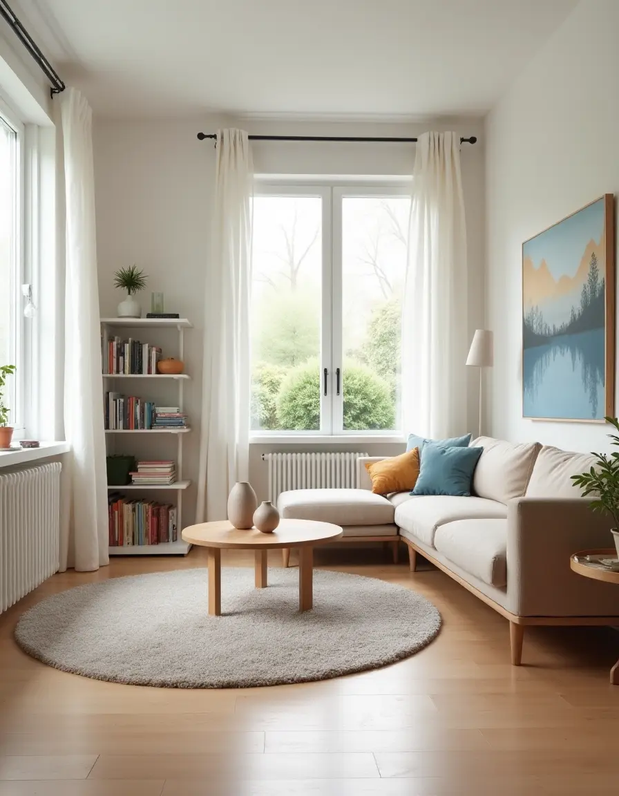The living room embodies Scandinavian style with its pale tones and inviting atmosphere. Light oak hardwood floors provide a warm base, while a plush, light gray area rug anchors the seating area. A minimalist beige sofa adorned with pastel-colored cushions is centrally placed, complemented by a mid-century coffee table in natural wood, adorned with a couple of chic ceramic vases. In one corner, a simple, white bookshelf displays an array of books and plants, while a large, abstract wall art piece in soft blue and earth tones captures the eye above the sofa. Soft, natural lighting filters through sheer white curtains, which frame a large window overlooking a serene outdoor space with greenery, accentuating the room's spacious feel and cozy functionality.
