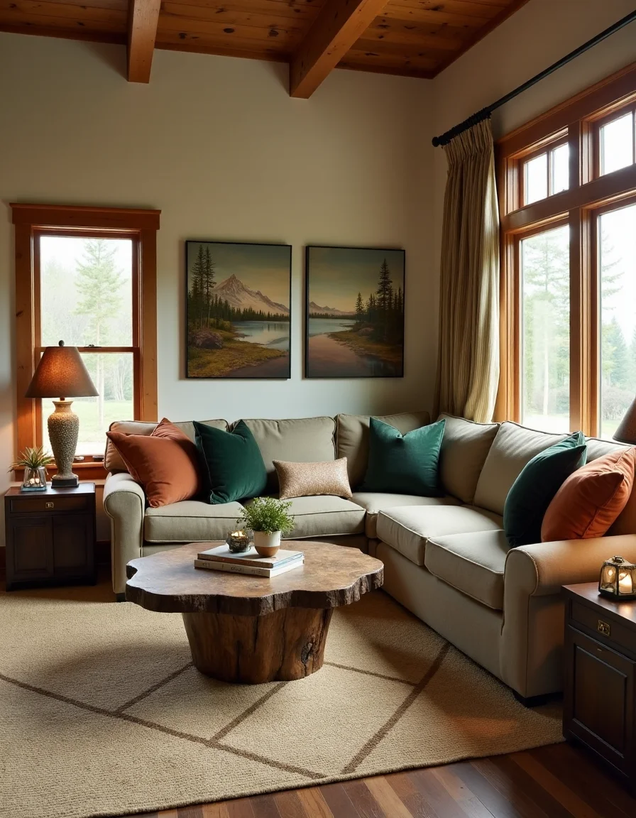 The living room exudes a cozy, rustic charm characterized by its warm earth tones and rugged aesthetics. A large sectional sofa in a muted taupe wool upholstery anchors the space, adorned with an array of textured throw pillows in deep greens and russet tones. A reclaimed wooden coffee table sits at the center, its rough-hewn surface complementing the antique barn wood side tables on either side, each topped with soft, glowing lanterns that diffuse a warm light. The room is accentuated with a large woven area rug featuring subtle geometric patterns, layering in richness underfoot. Vintage decor items like an old trunk and framed landscape paintings made with natural materials decorate the walls, all harmonizing to create a welcoming, grounded ambiance reminiscent of nature’s rugged beauty.