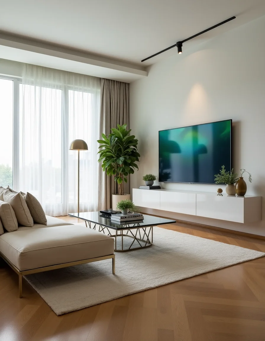 The living room features a modern design with an airy and open atmosphere, showcasing clean lines throughout. A large, sleek, rectangular glass coffee table sits at the center of the room, surrounded by a plush cream-colored sectional sofa that offers a minimalist look with its straight edges and low profile. On one wall, a contemporary media console in a high-gloss white finish holds the large flat-screen TV and sleek decorative knick-knacks, while a vibrant piece of abstract art in shades of blue and green provides a striking focal point. Soft natural light filters in through floor-to-ceiling windows adorned with sheer white curtains, illuminating the polished oak hardwood floors and enhancing the serene ambiance of the space. A simple floor lamp with a brushed steel finish stands next to the sofa, casting warm light for evening relaxation, while a few strategically placed potted plants add a touch of life without cluttering the sleek aesthetic.