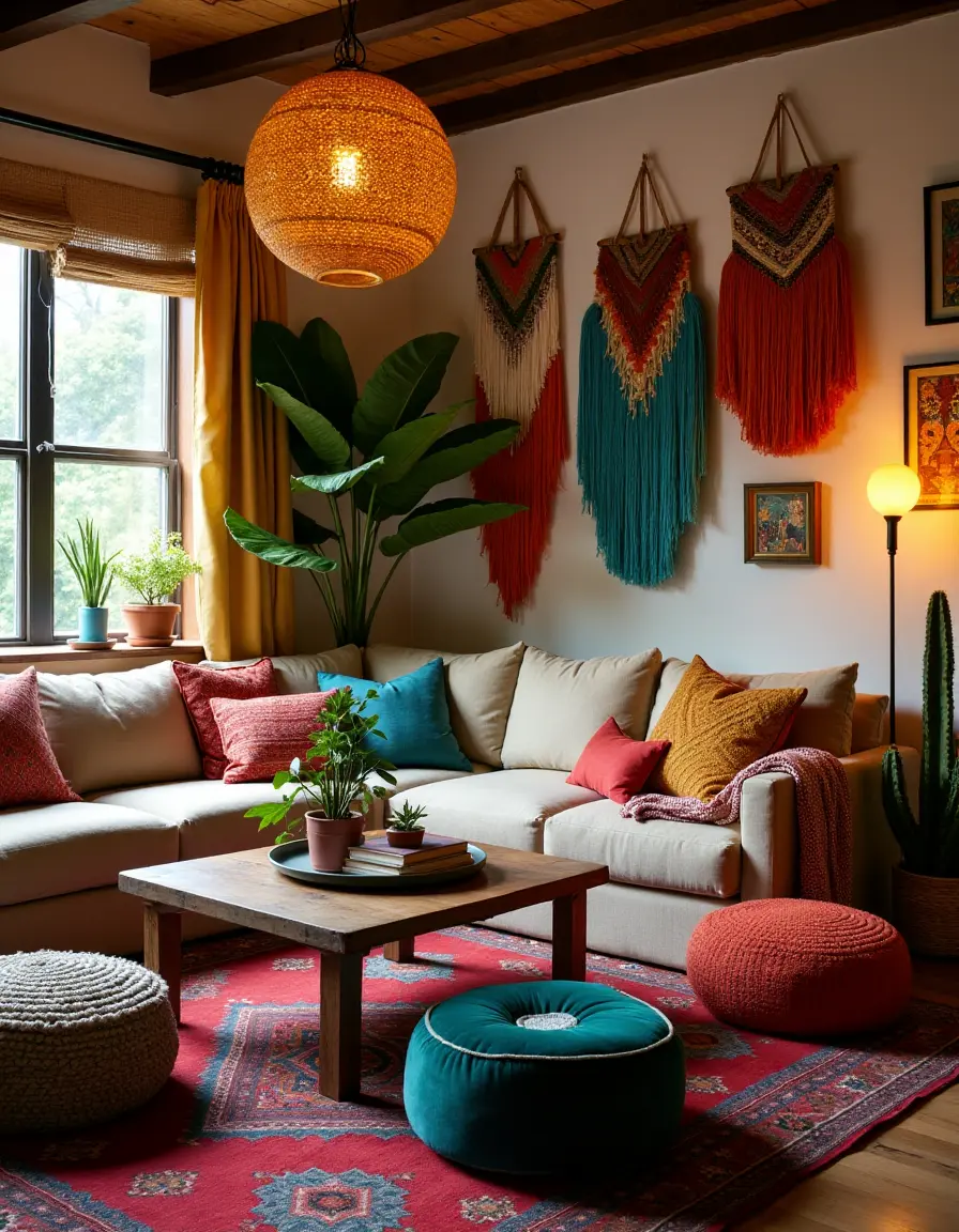 The living room is a vibrant tapestry of bohemian style, characterized by a medley of ethnic decor and varied furniture pieces that create an inviting and cheerful atmosphere. A large, handwoven Persian rug in rich reds and blues anchors the space, while mismatched throw pillows in bold patterns and colors adorn a low, comfortable sectional sofa in natural beige fabric. A rustic wooden coffee table, adorned with an assortment of potted succulents and a few eclectic books, sits centrally, surrounded by plush poufs in various textures, including a macrame pouf and a velvet one in deep teal. The walls are decorated with an array of framed tribal art and vintage mirrors, while colorful woven wall hangings cascade down, adding depth and warmth to the room. Soft, ambient lighting comes from a large, woven pendant lamp above and an assortment of floor and table lamps with warm-toned bulbs, creating a cozy retreat filled with life and creativity.