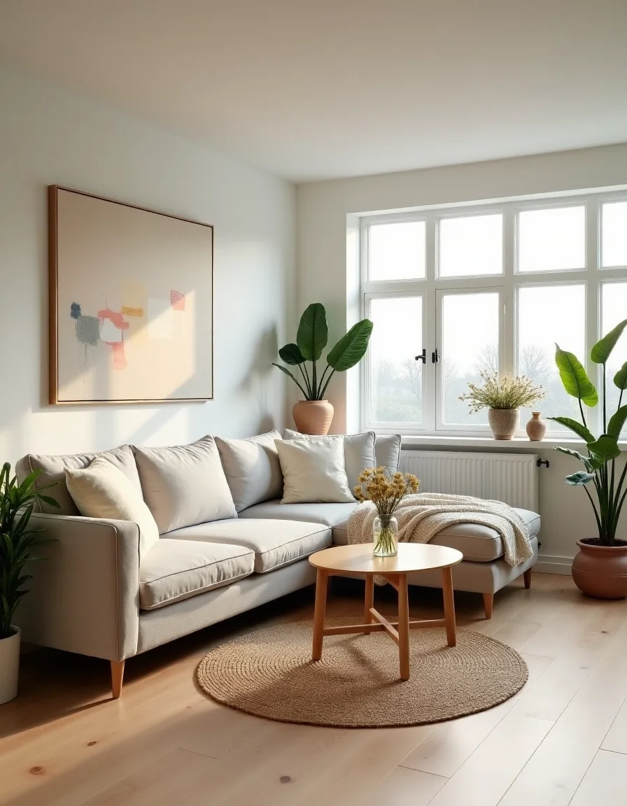 The living room embodies a serene Scandinavian aesthetic, showcasing light wooden flooring with subtle grains that enhance the spacious feel of the area. A plush, light gray sectional sofa, adorned with creamy white throw pillows and a soft knit blanket, is positioned in an L-shape against a wall of large windows, allowing ample natural light to filter in, illuminating the entire space. Adjacent to the sofa, a sleek, minimalist coffee table made of blonde oak holds a simple vase of wildflowers, while a handwoven jute area rug adds warmth beneath. On one wall, a large abstract painting in muted pastels complements the light color scheme, and a series of potted green plants in clay pots breathe life into the corners of the room, completing the inviting, nature-infused atmosphere.