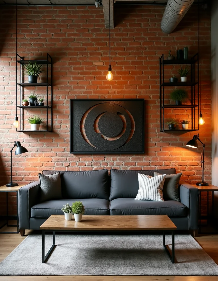 The living room epitomizes an industrial aesthetic with its exposed burnt brick walls that serve as a backdrop for a richly textured environment. A large, comfortable charcoal gray sectional sofa occupies the center, complemented by a rustic reclaimed wood coffee table with wrought iron legs, adding warmth to the space. Flanking the sofa are alternating metal and wood side tables that hold vintage Edison bulb table lamps, which exude a soft amber glow. Above, an assortment of industrial-style iron shelves mounted along the walls houses potted succulents and eclectic decor items, while a bold abstract metal wall art piece creates a striking focal point. Industrial pendant lights fashioned from pipes hang low over the seating area, completing the urban atmosphere.