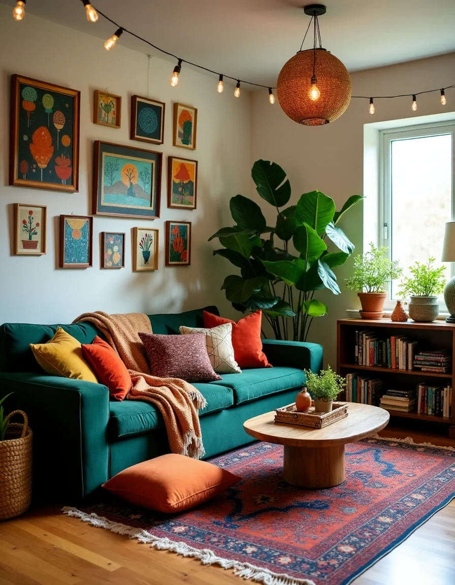 This bohemian living room is a vibrant blend of eclectic decor and comforting textures. The walls are adorned with an array of colorful paintings featuring abstract patterns and nature scenes, framed in mismatched vintage frames. A large, plush, multi-patterned area rug in hues of deep blue, terracotta, and mustard anchors the space, surrounding a low, circular wooden coffee table made of reclaimed wood. Overstuffed cushions in rich jewel tones and oversized floor pillows create a cozy seating area on a deep green sectional sofa draped with an embroidered throw blanket, while lush green plants like pothos and succulents peek out from woven baskets and hanging planters, adding an organic touch. String lights hang overhead, casting a warm glow, while a vintage bookshelf filled with books, art pieces, and handcrafted knickknacks adds personality and charm to the room.