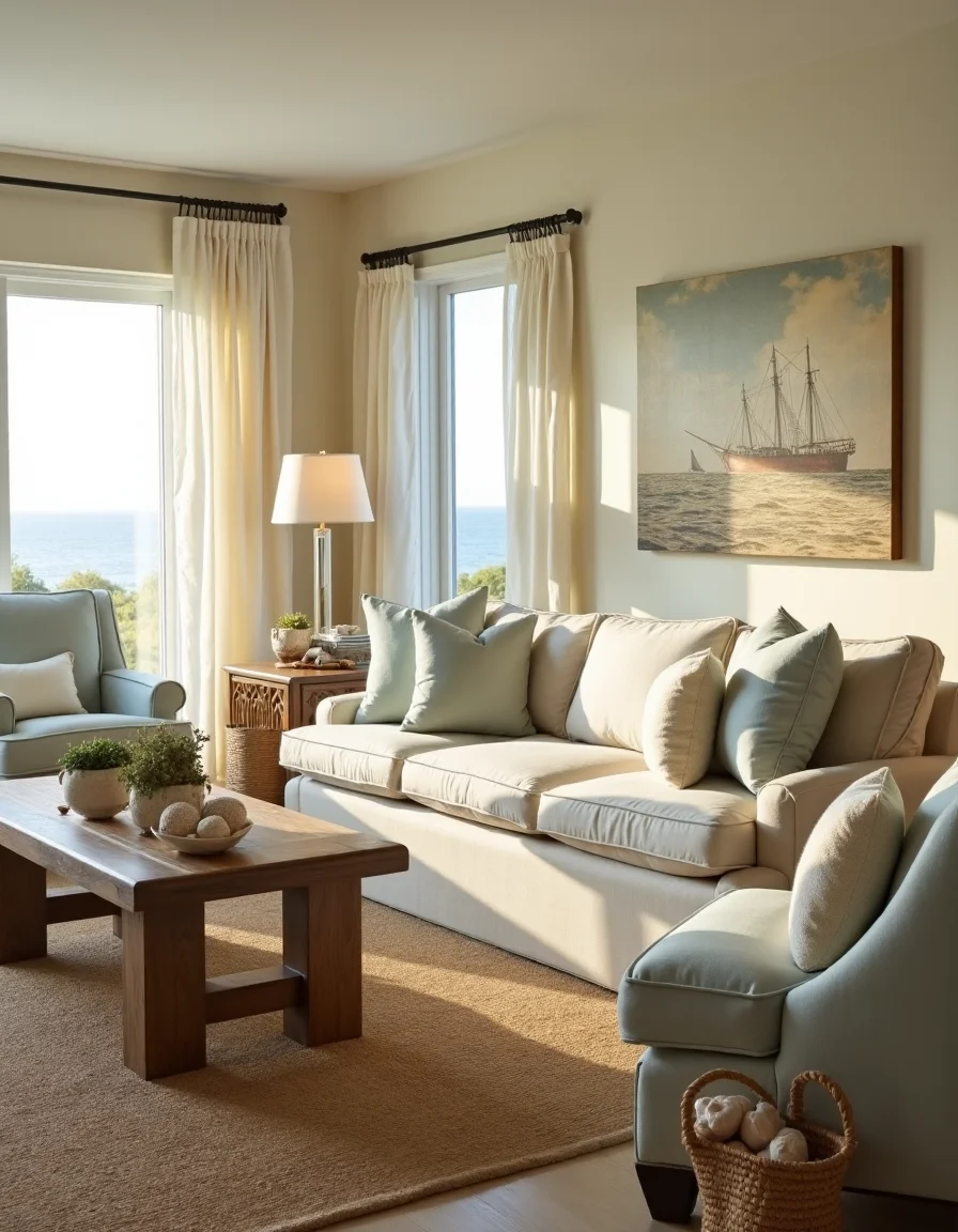 The living room exudes a serene seaside atmosphere, characterized by soft beige shades and natural textures. A large, comfortable sectional sofa covered in light, linen fabric faces a driftwood coffee table, adorned with a few seashells and a small potted plant for a touch of greenery. Soft, white sheer curtains billow gently in the breeze from a nearby open window, letting in golden sunlight that dances across the ship-themed wall art hung above the sofa. To the side, a rustic woven basket filled with plush cream-colored throws sits next to a coastal-themed accent chair upholstered in a soothing, light blue fabric, creating a relaxed and inviting ambiance. The room is anchored by a natural fiber jute rug, adding warmth and a beachy texture beneath barefooted visitors.