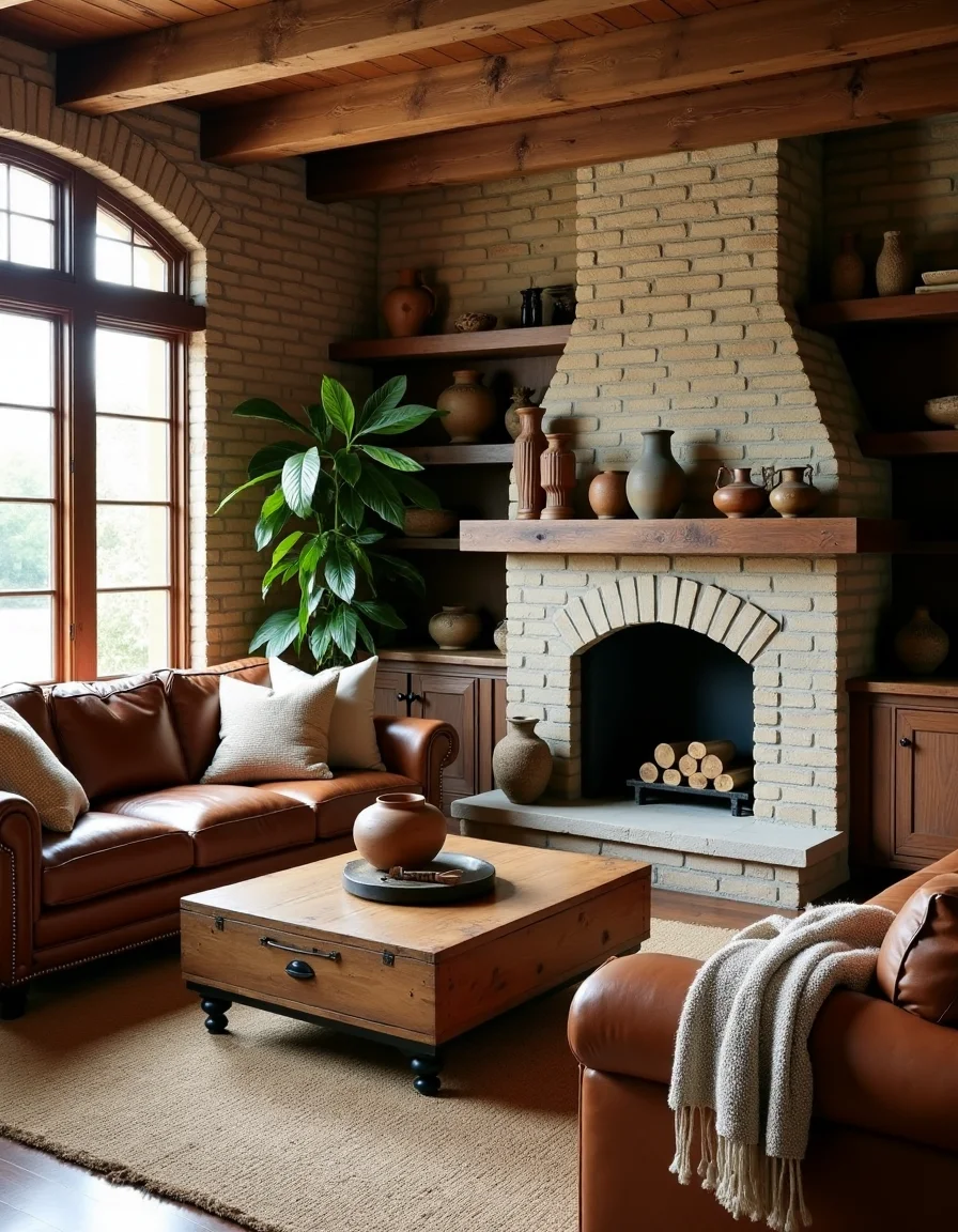 The living room exudes a warm rustic charm with exposed wooden beams adorning the ceiling and raw brick walls lining the space. An oversized distressed leather sofa in a rich chestnut hue is paired with a vintage reclaimed wood coffee table, artfully displayed atop a handwoven jute rug. A collection of artisanal pottery sits on the mantle of a large stone fireplace, while thick woolen throws in earthy tones are draped over the sofa's arms, inviting coziness. In one corner, a tall, leafy indoor plant adds a splash of verdant color to the scene, while natural light filters through large, rustic-framed windows, illuminating the space and highlighting the craftsmanship of antique wooden shelves filled with curated treasures.
