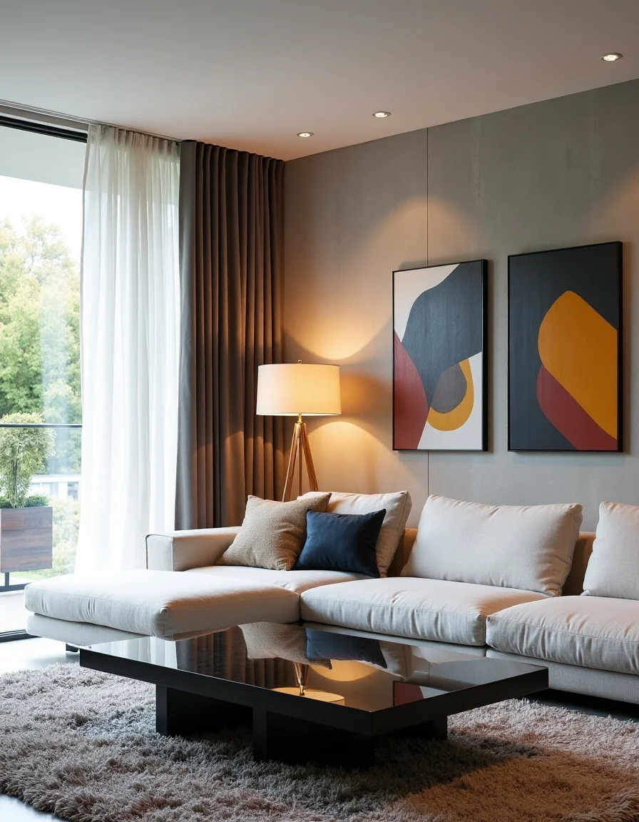 The living room embodies a modern aesthetic, defined by its sleek glass and concrete elements. A large, rectangular coffee table crafted from tempered glass sits atop a plush, gray shag rug, surrounded by a sectional sofa upholstered in a soft, neutral white fabric. Elegantly framed artworks with abstract designs in bold colors adorn the concrete walls, while a statement floor lamp with a geometric design stands in one corner, casting warm light. Large, floor-to-ceiling windows invite natural light to flow in, framed by sheer white curtains that flutter gently in the breeze, enhancing the open, airy feel of the space.