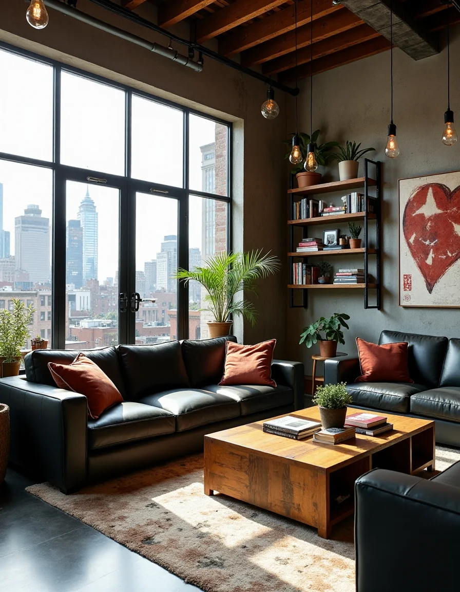 The living room is a masterpiece of industrial style, characterized by expansive ceiling windows that flood the space with natural light and showcase a stunning urban skyline. The walls are a mix of exposed concrete and brick, creating a raw backdrop complemented by black iron shelves filled with eclectic decor such as vintage books and potted succulents. A large, reclaimed wood coffee table sits in the center, surrounded by plush leather sofas in deep charcoal, their textures contrasting beautifully with a soft, distressed area rug beneath. This room is finished with elements like pendant lighting featuring Edison bulbs, a bold metallic wall clock, and an art piece with bold graffiti that captures the essence of industrial chic, all harmoniously arranged to create an inviting yet edgy atmosphere.