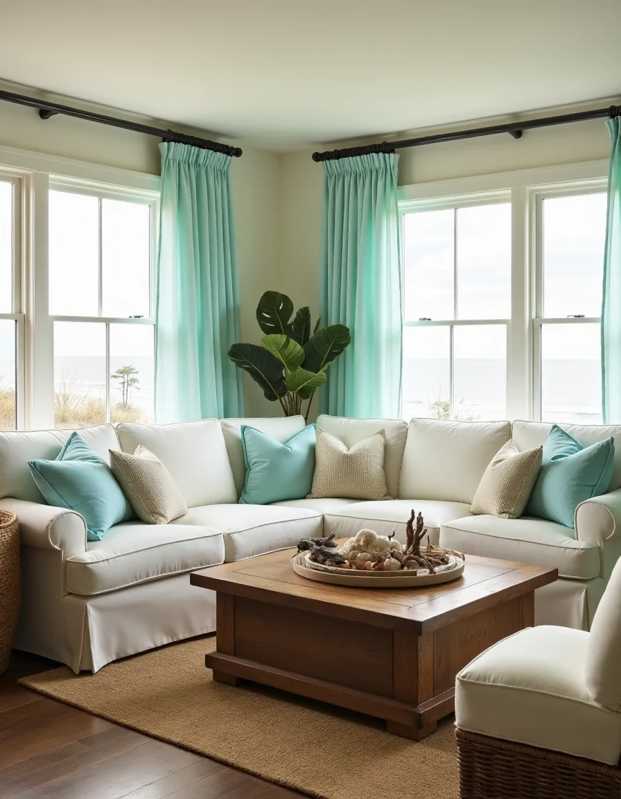 The living room features a serene seaside style, adorned with a large plush white sectional couch that embraces the coastal ambiance. Framed by sheer light aqua curtains that gently sway with the ocean breeze, the windows invite warm sunlight to brighten the space. A rustic wooden coffee table sits in the center, topped with nautical decor, including seashells and driftwood accents. In one corner, an oversized wicker armchair with a thick cream cushion provides an inviting reading nook, while a soft jute area rug harmonizes the whole arrangement, bringing together earth tones with a splash of pastel blue from the decorative throw pillows scattered across the couch.