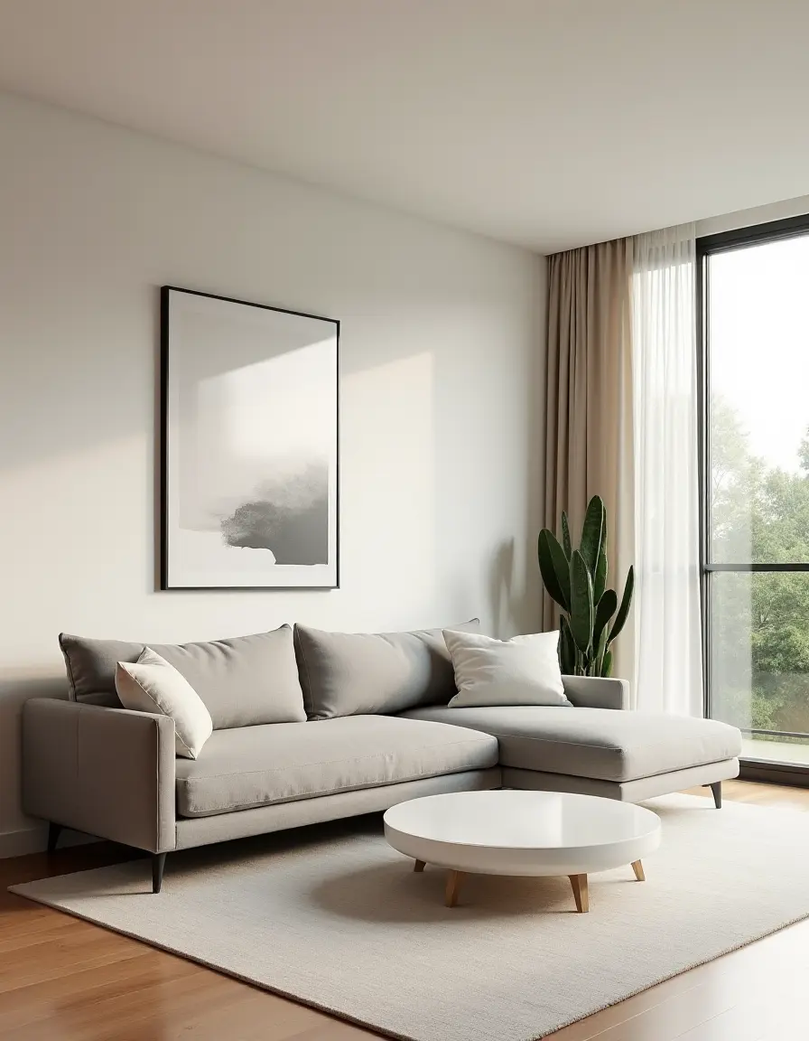 The living room features a minimalist design with an uncluttered layout that maximizes space and functionality. A large, soft gray sectional sofa anchors the room, paired with a simple, low-profile white coffee table made of sleek, lacquered wood. A single large abstract painting in monochromatic tones hangs above the couch, providing a focal point without overwhelming the senses. Natural light floods in through expansive floor-to-ceiling windows, complemented by sheer linen curtains in a delicate beige hue, enhancing the neutral color palette. A few well-chosen plants, like a tall spiky snake plant in a minimalist ceramic pot, add a touch of life and warmth without clutter, creating a serene and inviting atmosphere.