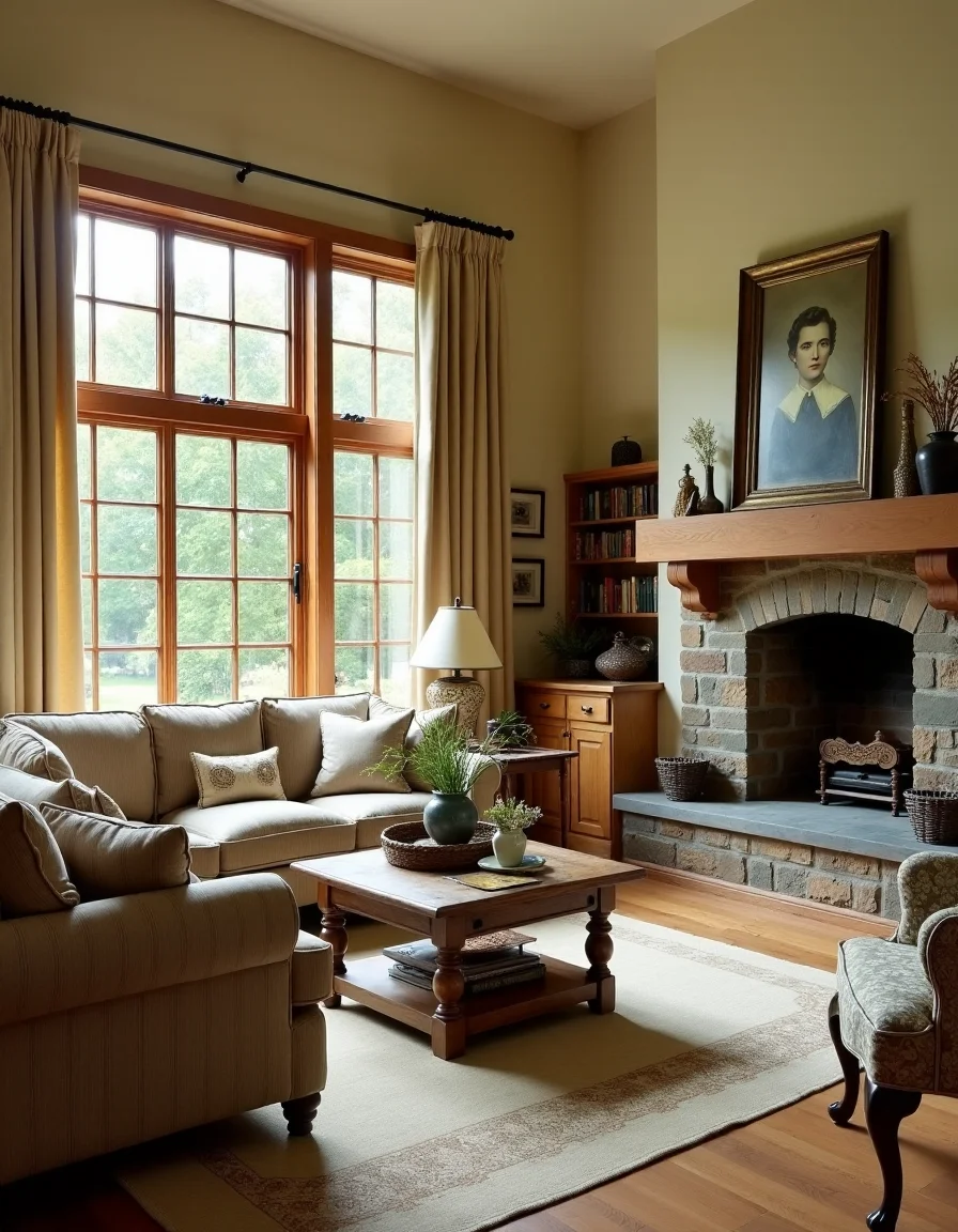 The living room exudes a warm and inviting country style, centered around a charming, rustic stone fireplace that serves as the focal point of the space. Natural light floods the room through large, wooden-framed windows adorned with beige linen drapes, illuminating the earthy tones and textures of the surrounding decor. A cozy, overstuffed sectional couch upholstered in a soft, plaid fabric faces the fireplace, complemented by a distressed wooden coffee table with a weathered finish, adorned with a vase of wildflowers. Flanking the fireplace are two vintage armchairs in muted floral fabric, adding a touch of retro charm, while an area rug featuring a soft cream and light brown pattern ties the seating area together. Family heirlooms and rustic touches like a set of antique books on a shelf, and framed portraits of past generations, further enrich the nostalgic ambiance of this delightful living space.