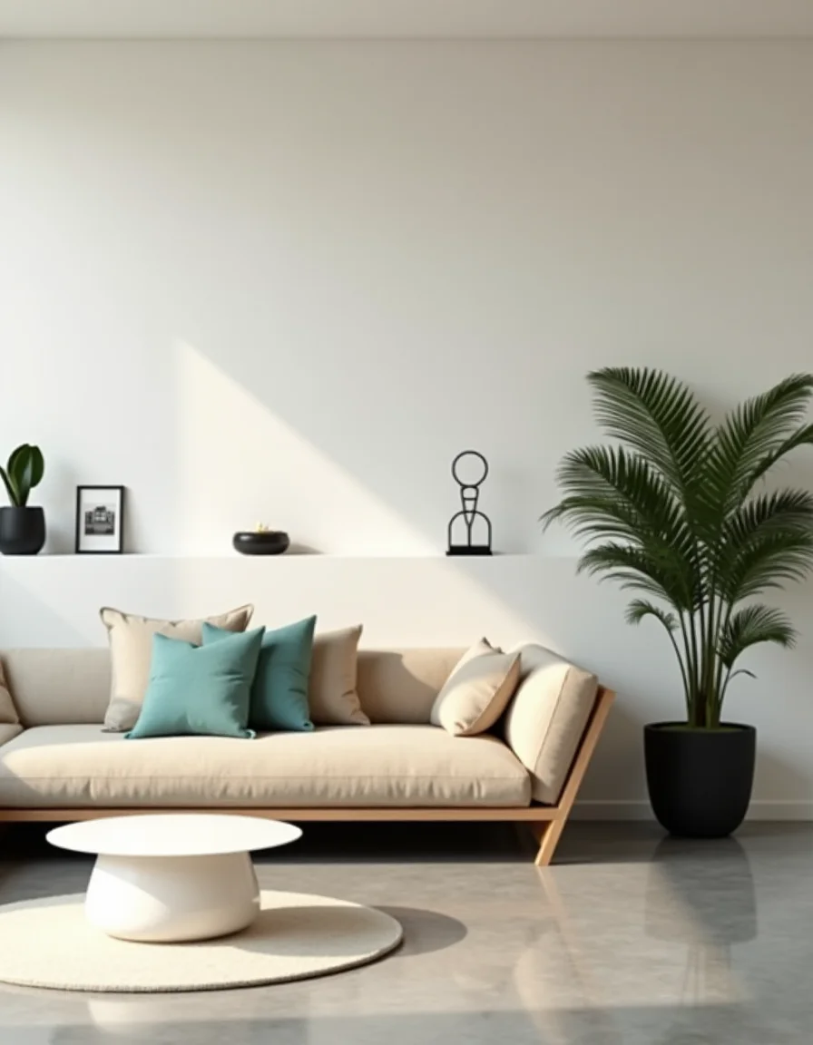 The minimalist living room features a spacious layout that emphasizes negative space, allowing for serenity and tranquility. At the center, a sleek, low-profile beige sectional sofa with clean lines sits on a polished concrete floor, accented by a single geometric throw pillow in soft teal. A round, white coffee table made of lightweight fiberglass complements the sofa, while a large potted fern placed in the corner introduces a refreshing touch of greenery that enhances the airy atmosphere. Along the walls, floating shelves hold a few carefully selected decor pieces—an abstract sculpture in matte black and a small, framed monochrome print—keeping surfaces clear and uncluttered. The overall color palette comprises muted tones of white, beige, and soft earthiness combined with a splash of teal to add modern sophistication and warmth to the minimal aesthetic.